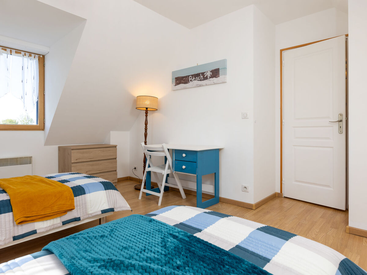 À l'étage supérieur: 1 chambre avec 2 lits (90 cm, longueur 190 cm).