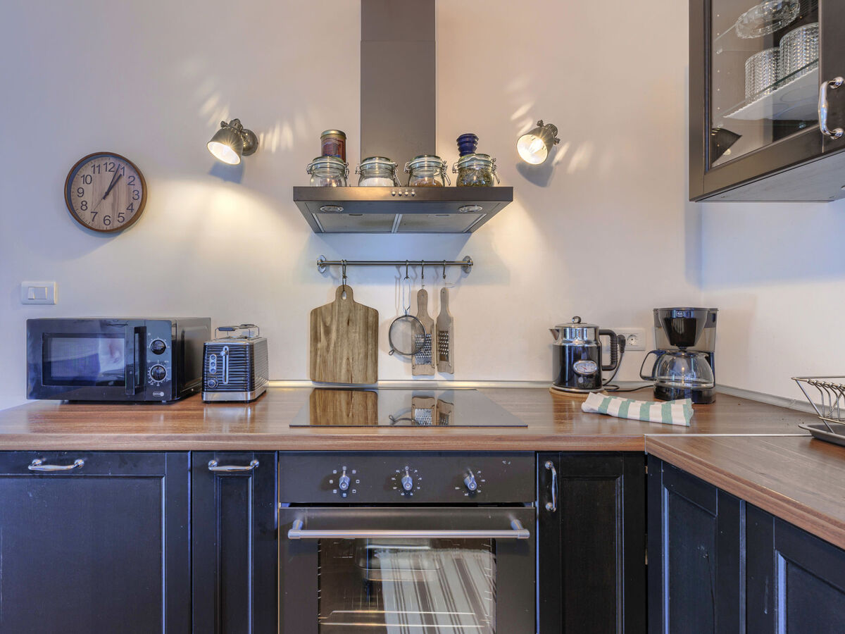 Cuisine ouverte (four, lave-vaisselle, 4 plaques à induction, grille-pain, bouilloire électrique, micro-ondes, congélateur, cafetière électrique).