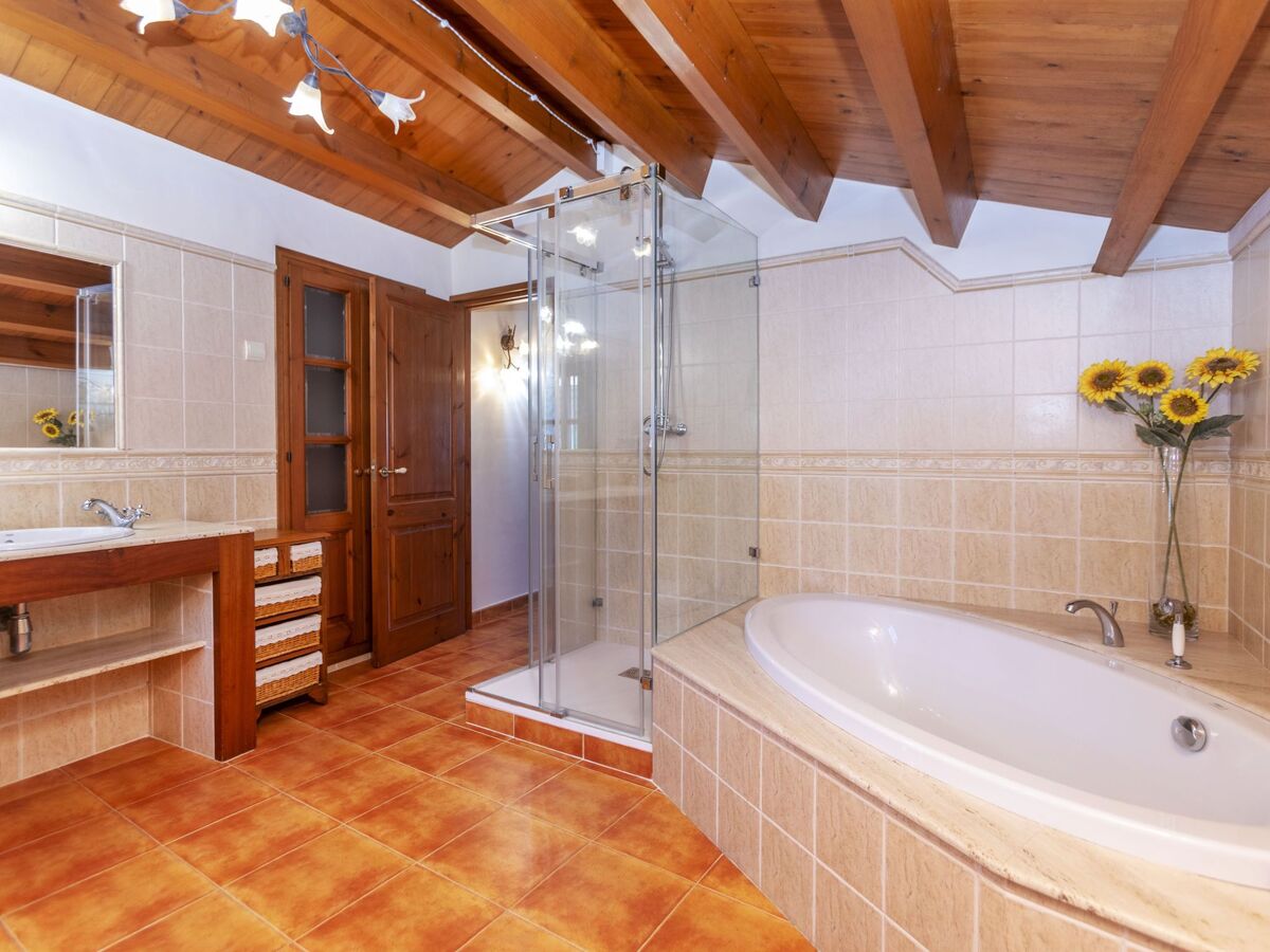 À l'étage supérieur: avec 1 grand-lit (150 cm, longueur 190 cm), bain/douche/bidet/WC et double vasque.
