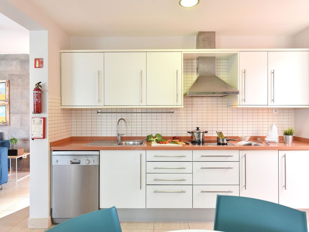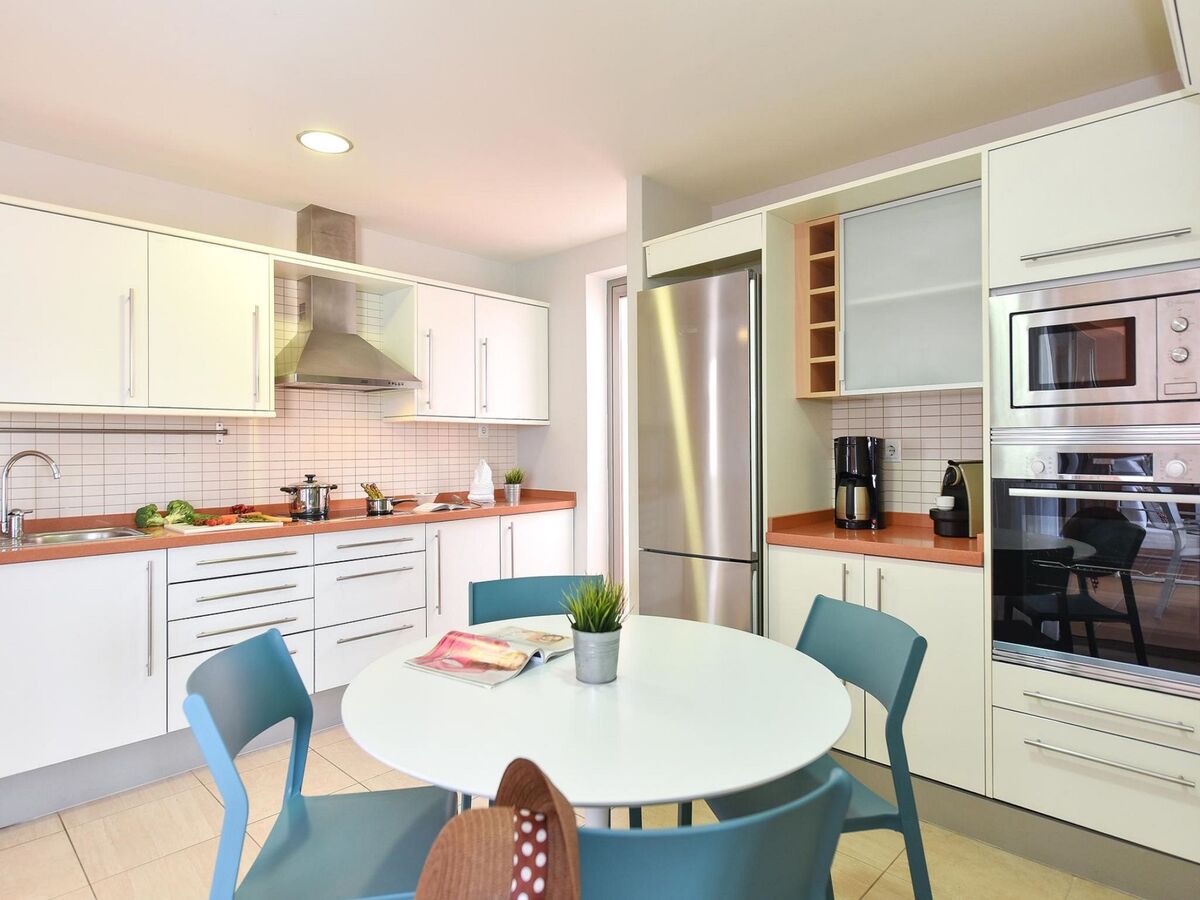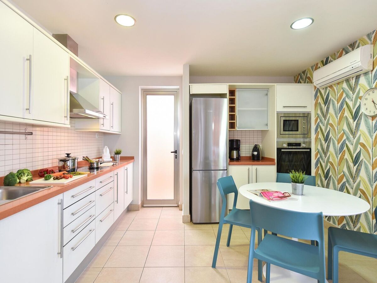Cuisine (four, lave-vaisselle, 4 plaques vitrocéramiques, grille-pain, bouilloire électrique, micro-ondes, congélateur, cafetière électrique) avec table pour les repas.