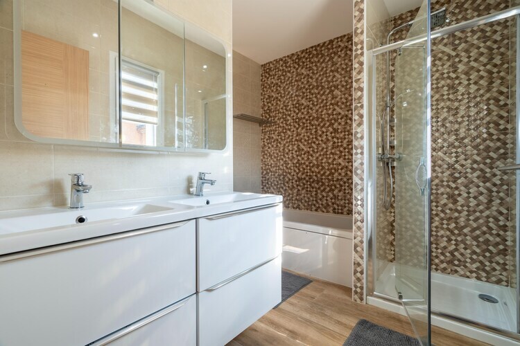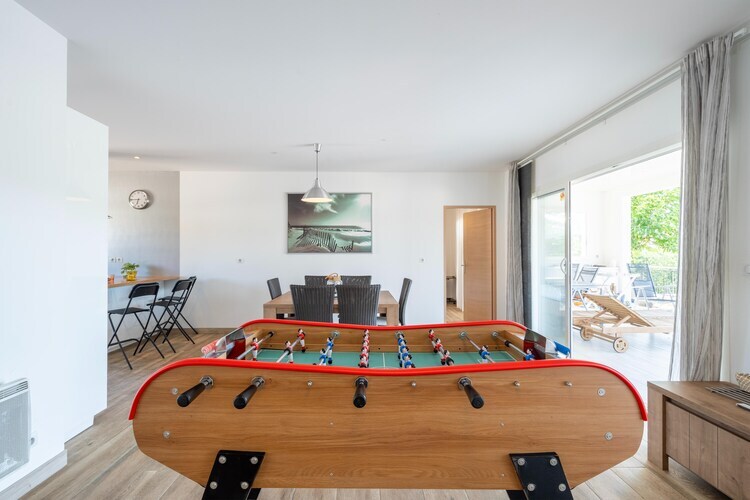 Rez-de-chaussée: (couloir, Salle de séjour(TV, coin salon), salle à manger(table(8 personnes)), cuisine(bouilloire, grille-pain, plaque de cuisson(induction), cafetière/percolateur, four, micro ondes, lave-vaisselle , combinaison réfrigérateur/congélateur), chambre(lit double(140 x 200 cm)), chambre(lit double(140 x 200 cm)), chambre(lit gigogne 2 personnes), salle de bains(douche, lavabo), WC, WC, salle de jeux(baby-foot)) Au 1er étage: (chambre avec salle de bains(lit double(160 x 200 cm), baignoire, douche, WC)) Sous-sol: (buanderie (sèche-linge, lave-linge )) terrasse(couverte, 35 m2), terrasse(40 m2), jardin, transats, barbecue, parking, piscine(privé, clôturé, 9 x 4 m.)