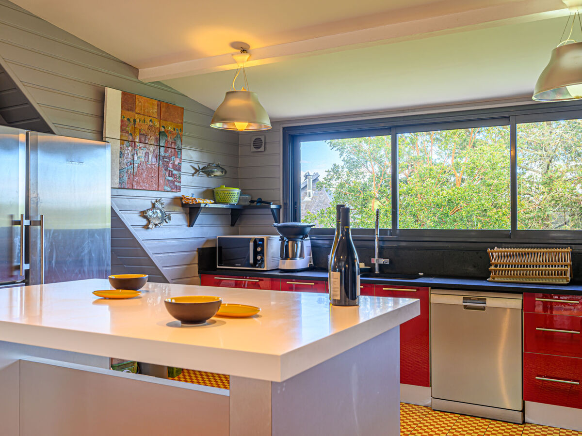Cuisine ouverte (four, lave-vaisselle, 5 feux, grille-pain, bouilloire électrique, congélateur, cafetière électrique, ilot de cuisine).