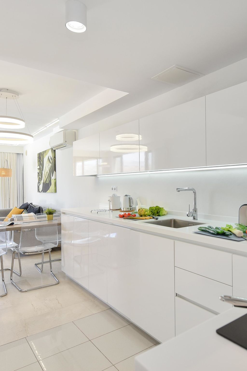 Cuisine ouverte (four, lave-vaisselle, 4 plaques vitrocéramiques, grille-pain, bouilloire électrique, micro-ondes, congélateur, cafetière électrique) avec table pour les repas.