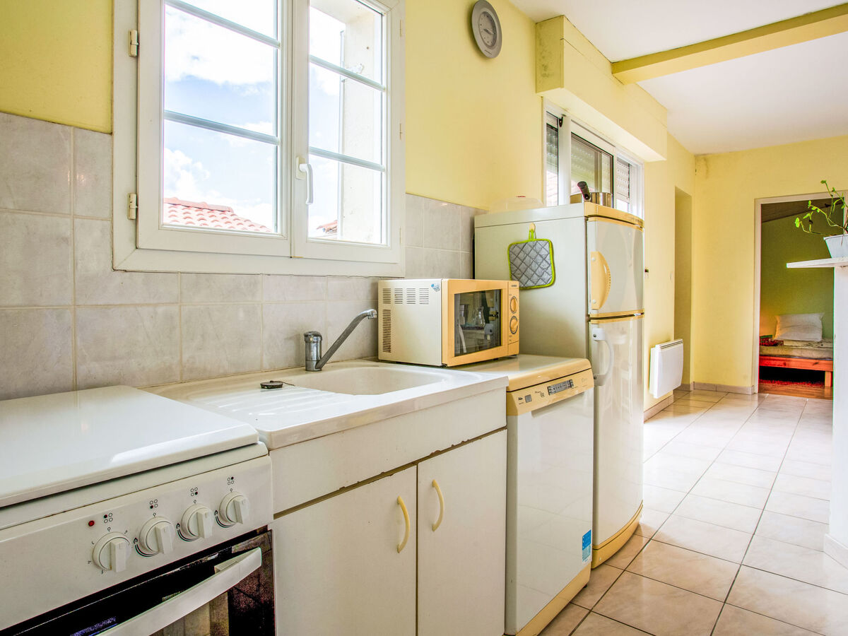 Cuisine ouverte (1 plaque de cuisson, four, lave-vaisselle, 3 feux, grille-pain, bouilloire électrique, micro-ondes, congélateur, cafetière électrique) avec passe-plat.