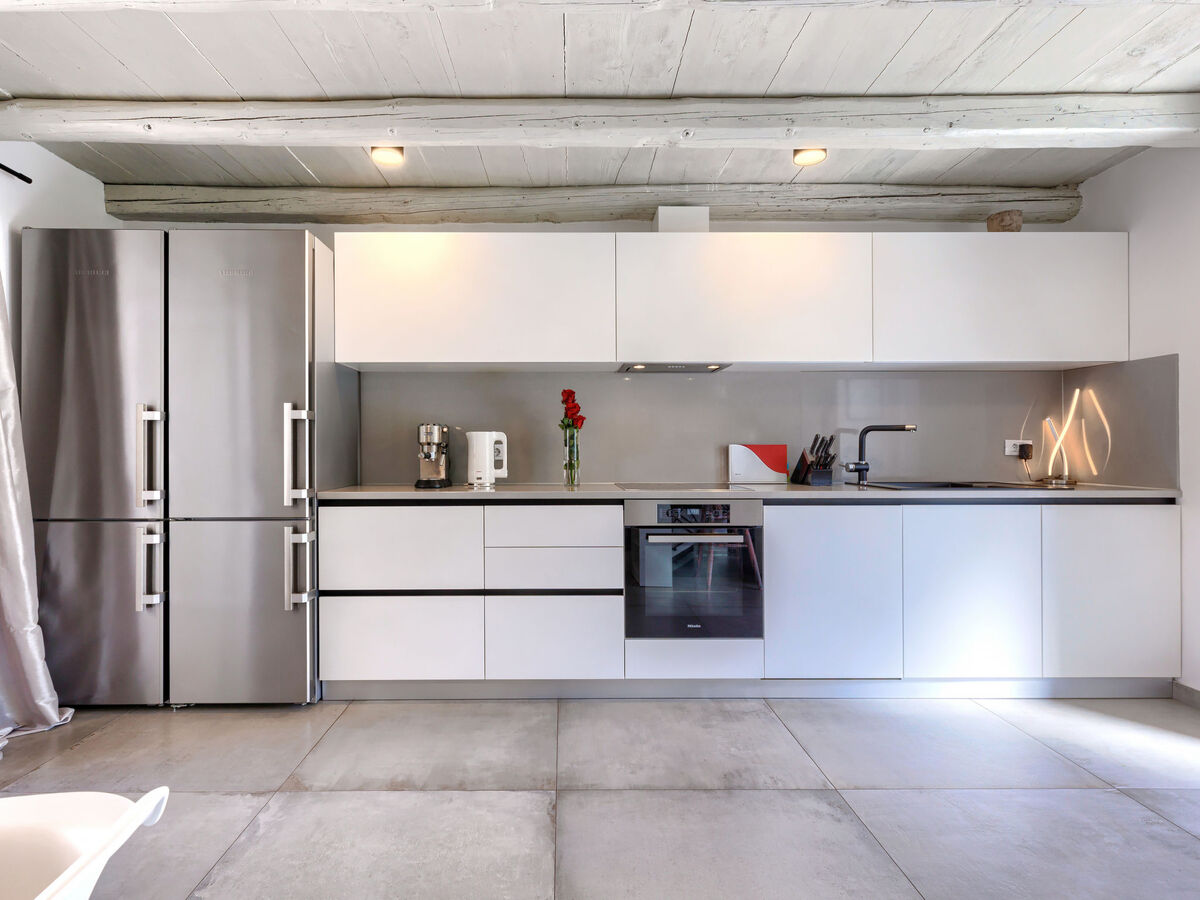 Cuisine ouverte (four, lave-vaisselle, 4 plaques vitrocéramiques, grille-pain, bouilloire électrique, micro-ondes, congélateur, cafetière électrique).