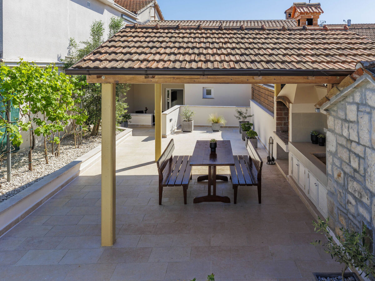 A usage privé: terrain 500 m2 (clôturé), jardin avec plantes, piscine rectangulaire (24 m2, profondeur 140 cm, disponibilité saisonnière: 01.Mai.