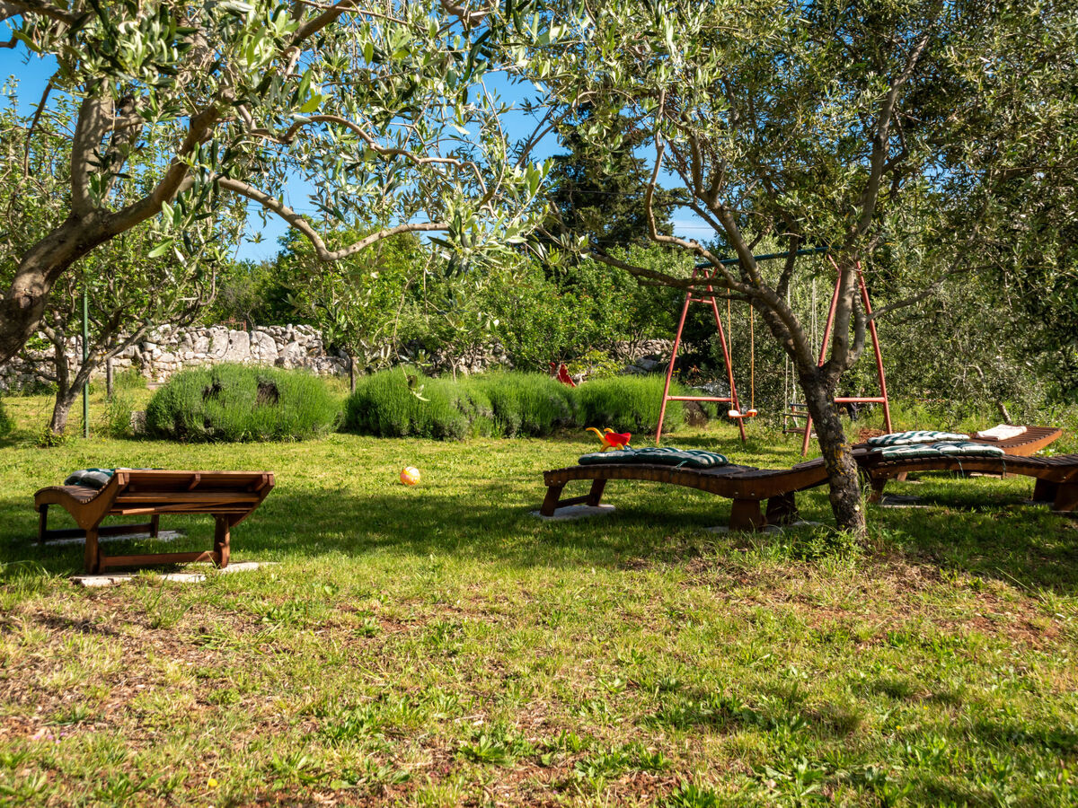 Douche extérieure, terrasse (10 m2), meubles de jardin, barbecue, espace de jeux pour les enfants (balançoire).