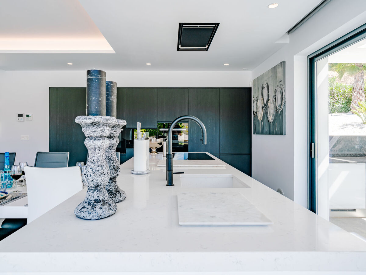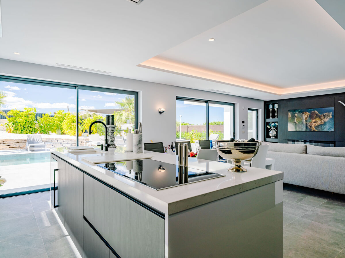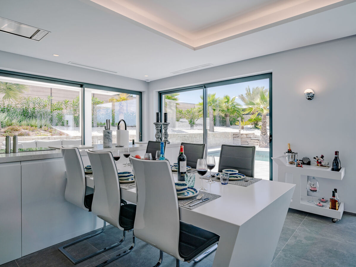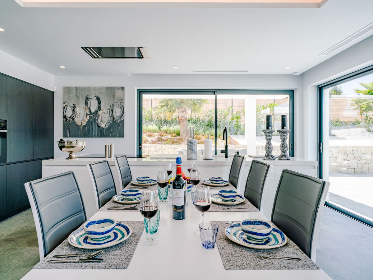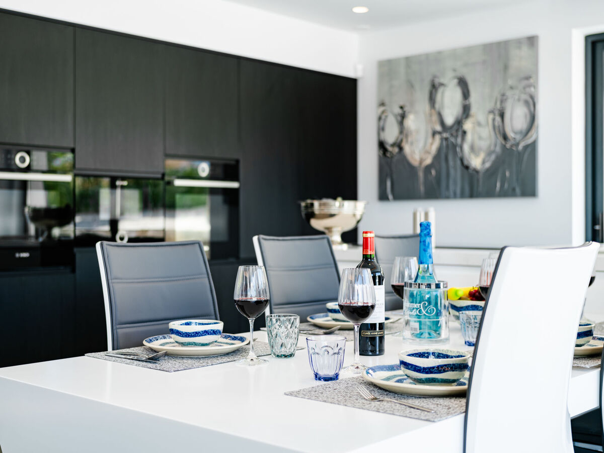 Grande cuisine ouverte (four, lave-vaisselle, 5 plaques à induction, grille-pain, micro-ondes, congélateur, cafetière électrique, Capsules pour machine à café (Dolce Gusto)) avec bar, table pour les repas, air-conditionné et chauffage à air chaud.