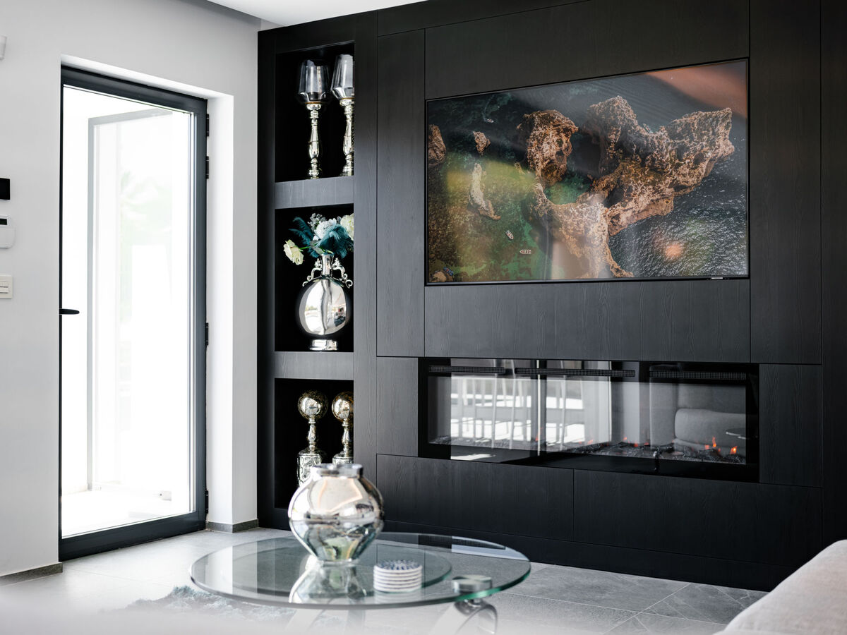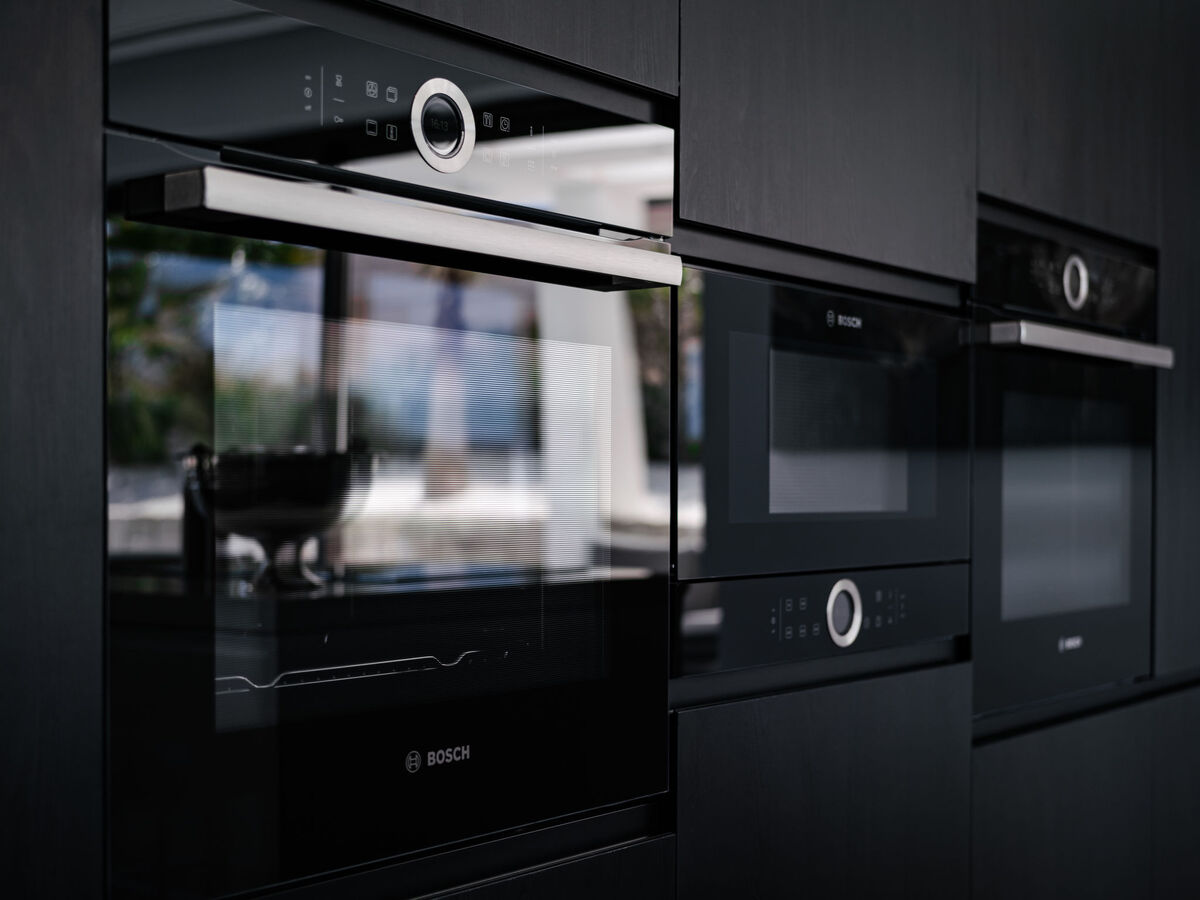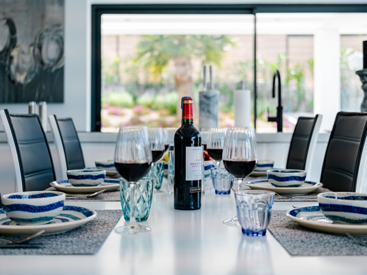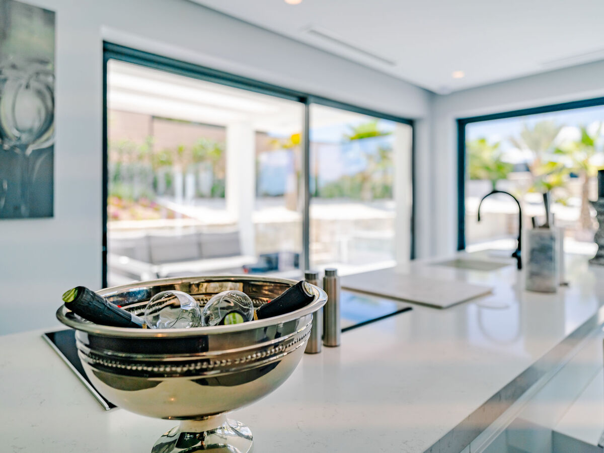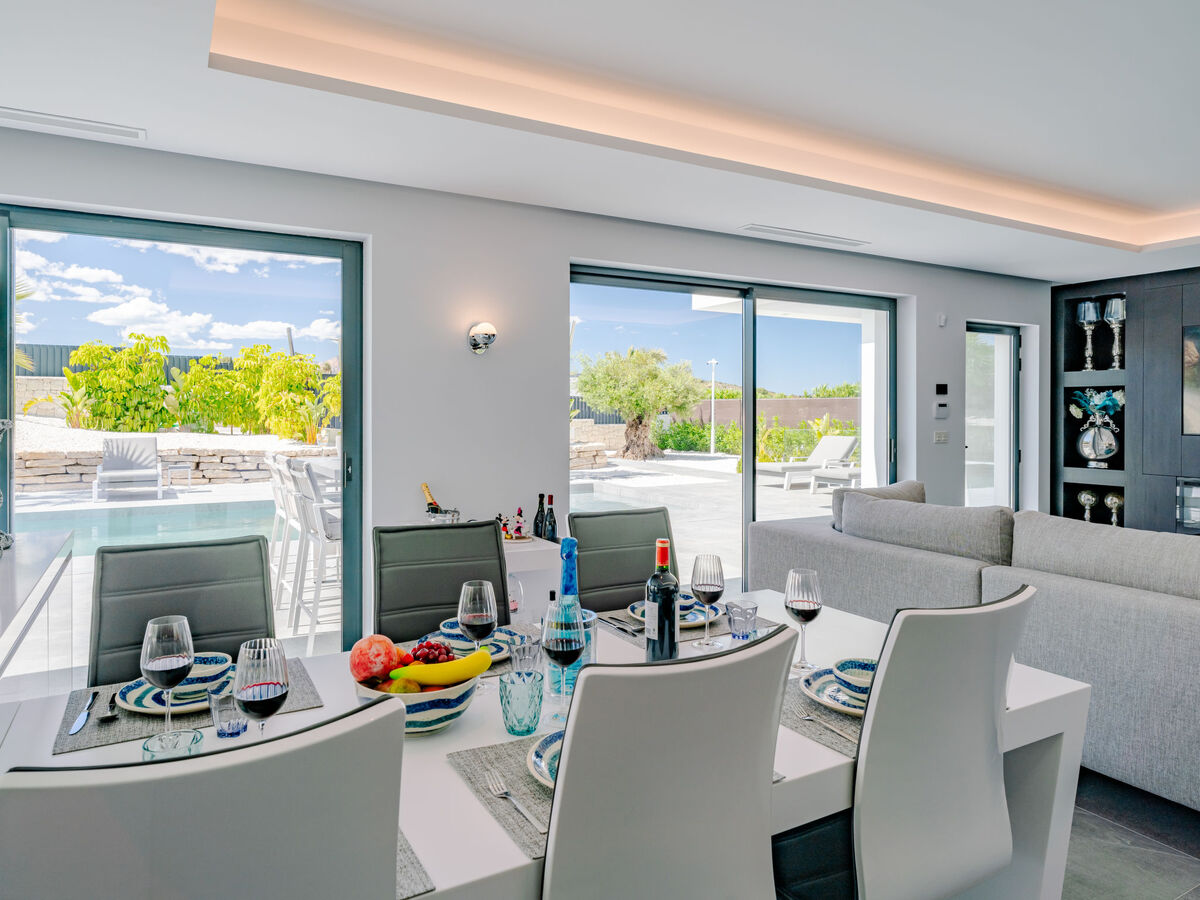 Grande cuisine ouverte (four, lave-vaisselle, 5 plaques à induction, grille-pain, micro-ondes, congélateur, cafetière électrique, Capsules pour machine à café (Dolce Gusto)) avec bar, table pour les repas, air-conditionné et chauffage à air chaud.
