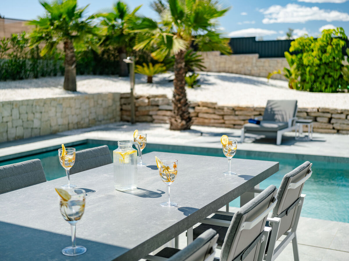 Douche extérieure, pool house avec réfrigérateur, pergola, terrasse, meubles de jardin, barbecue.