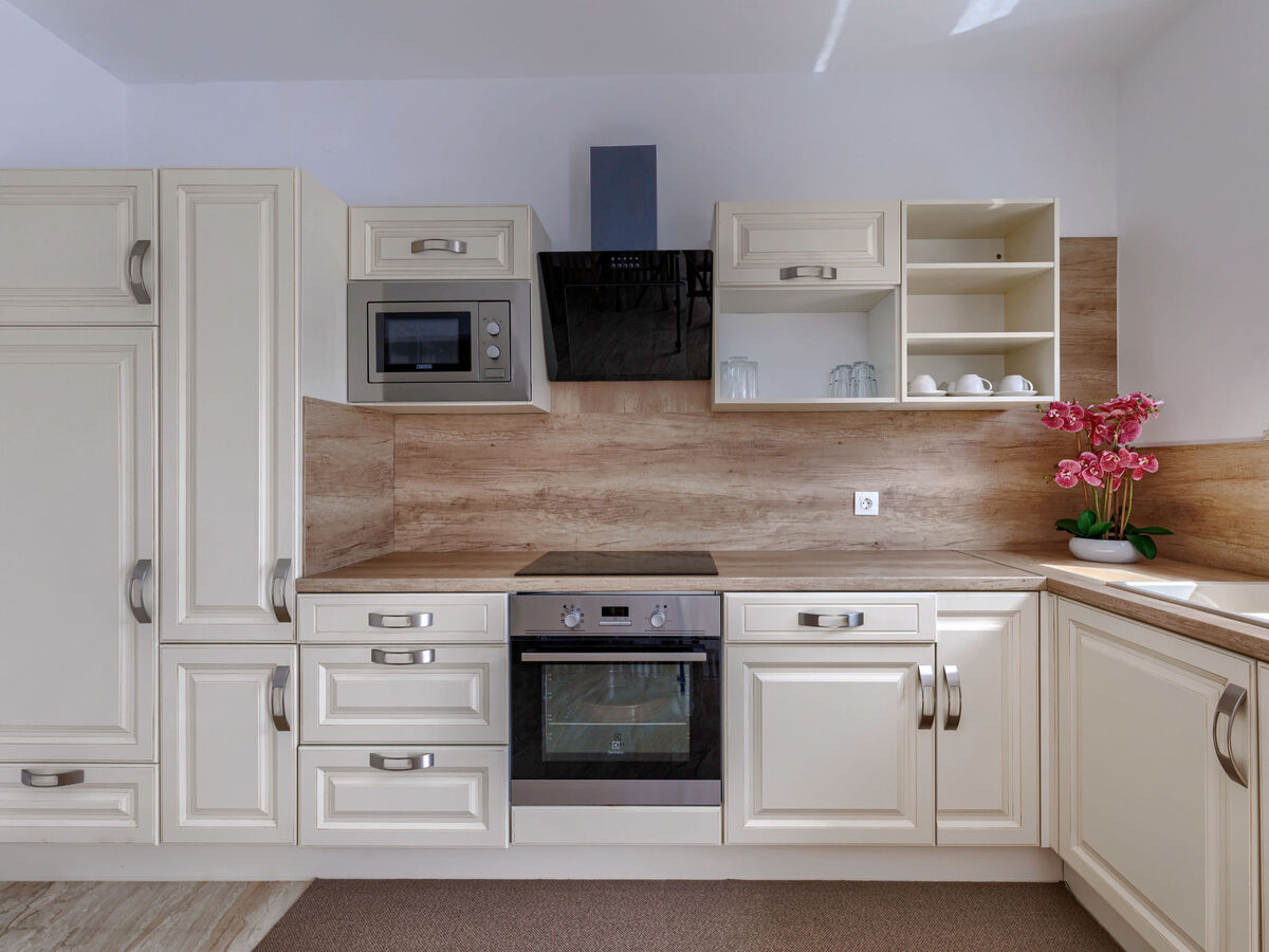 Cuisine ouverte (four, lave-vaisselle, 4 plaques vitrocéramiques, grille-pain, bouilloire électrique, micro-ondes, congélateur, cafetière électrique).