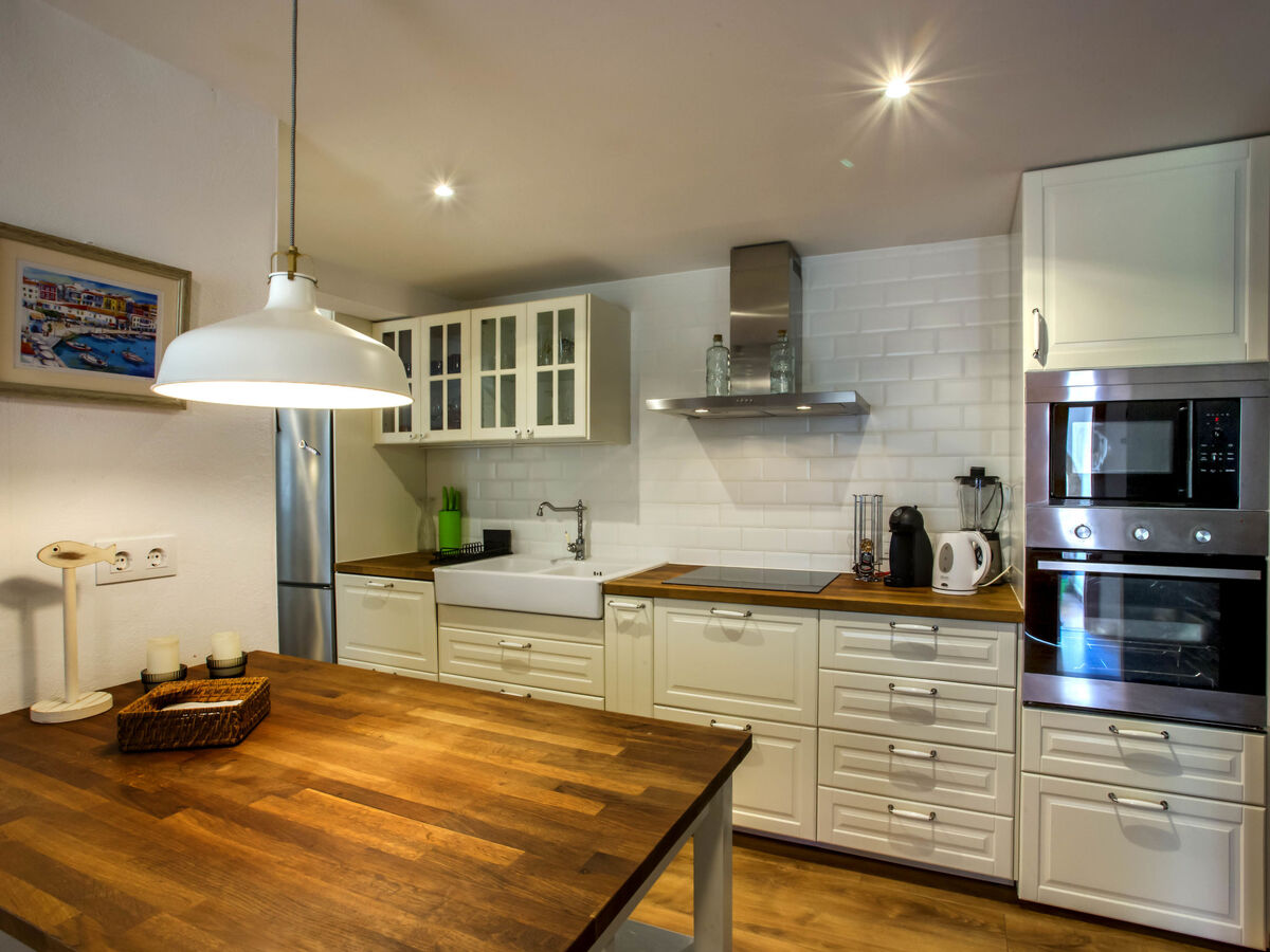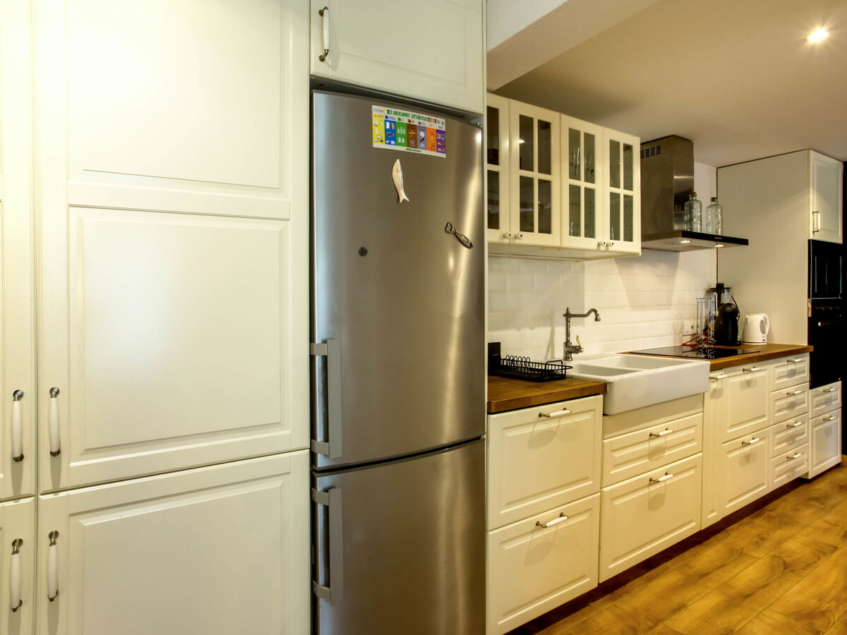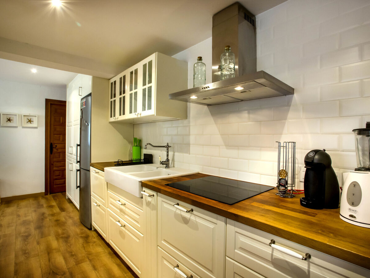 Cuisine ouverte (four, lave-vaisselle, 4 plaques à induction, grille-pain, bouilloire électrique, micro-ondes, congélateur, cafetière électrique).