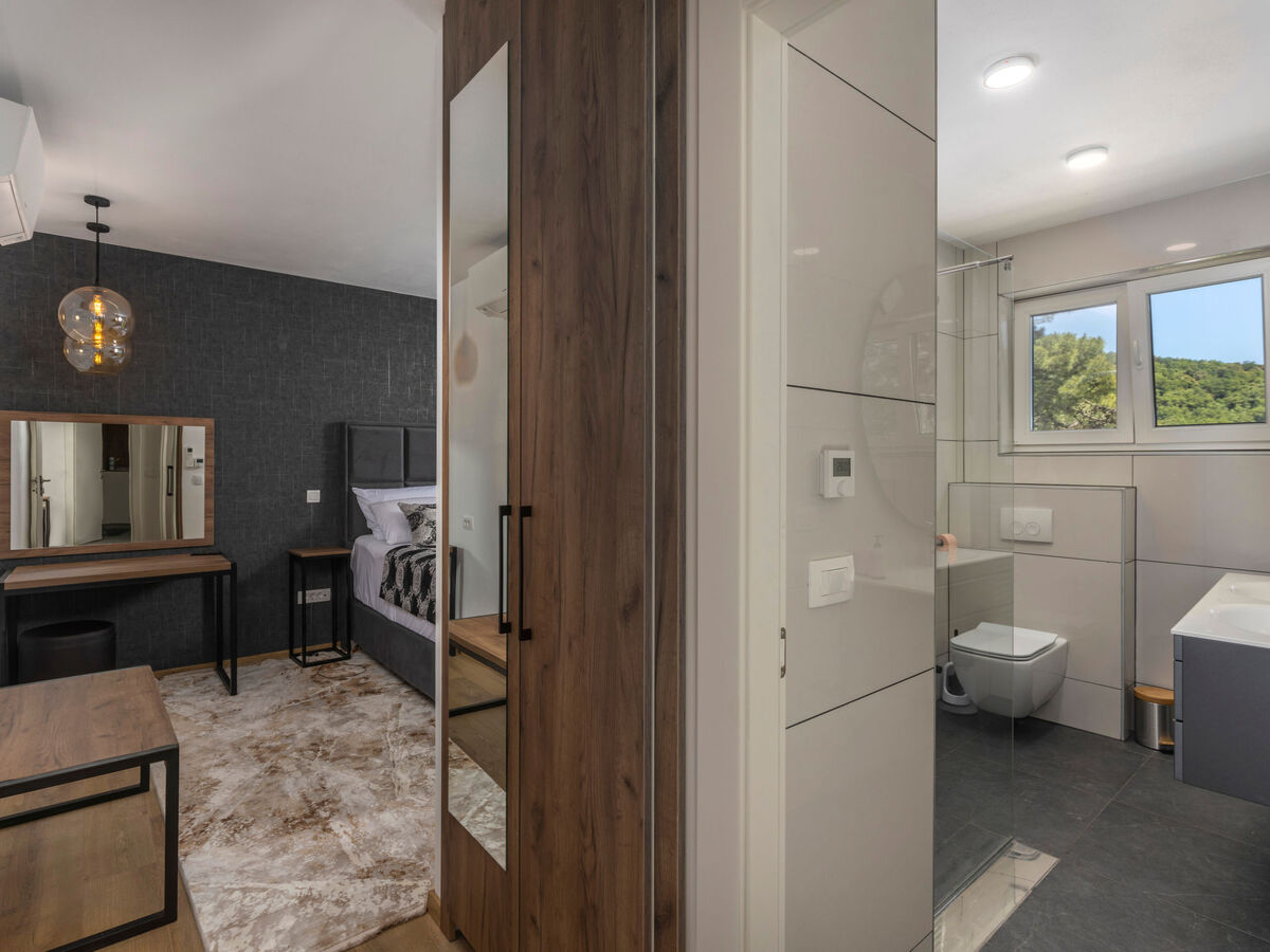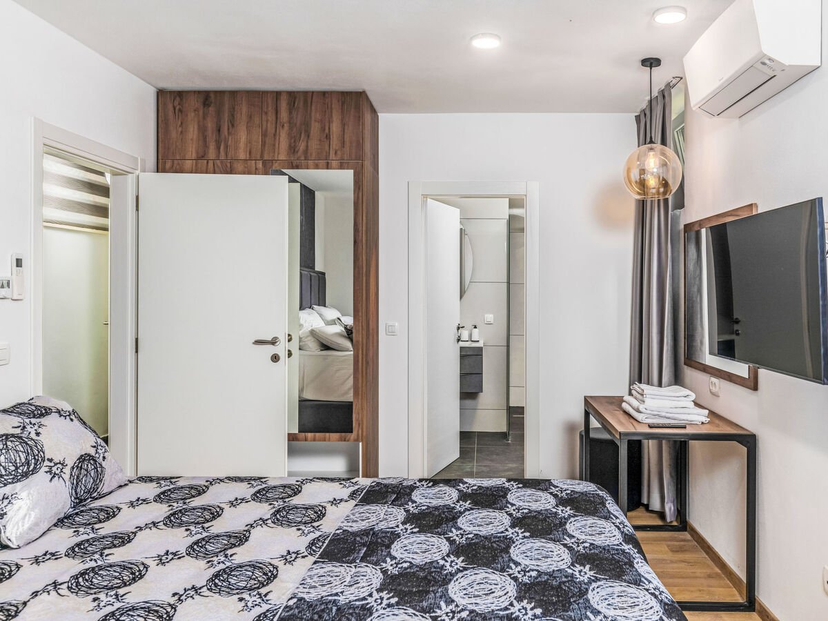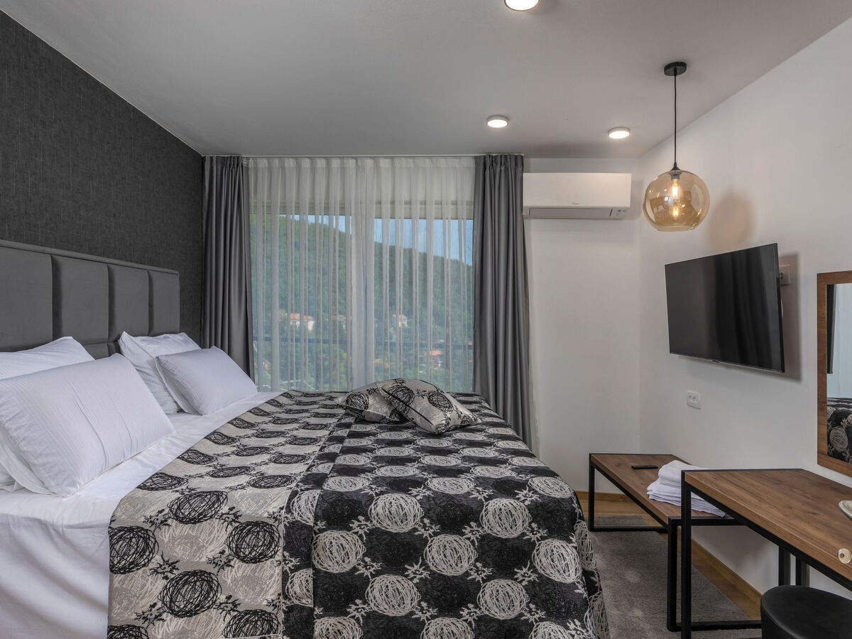 1 chambre avec 1 grand-lit (200 cm, longueur 210 cm), douche/WC, double vasque et TV (écran plat), air-conditionné.