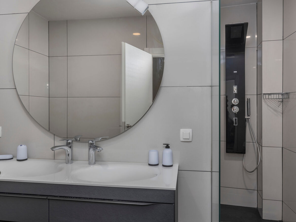 À l'étage inférieur: 1 chambre avec 1 grand-lit (200 cm, longueur 210 cm), douche/WC, double vasque et TV (écran plat), air-conditionné.