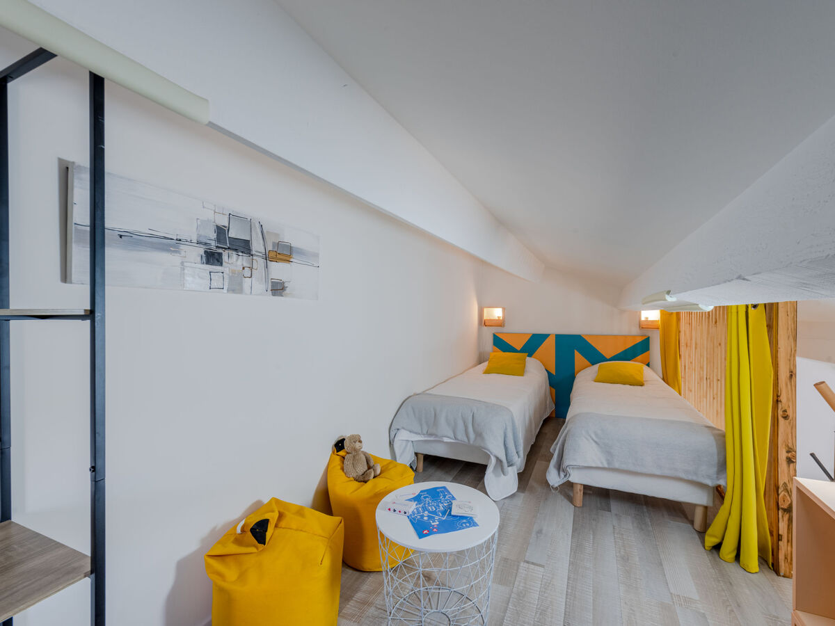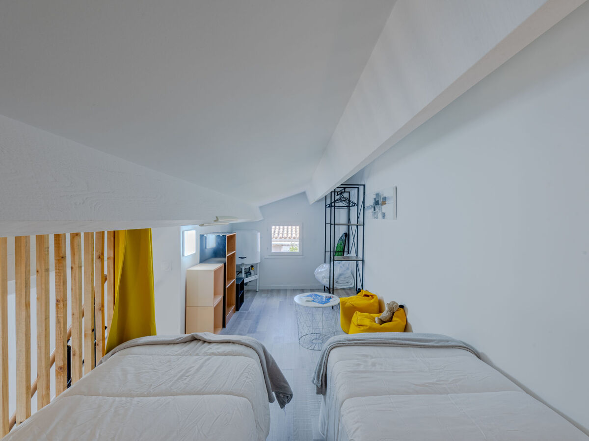 À l'étage supérieur: (escalier raide) galerie mansardée, ouverte, hauteur plafond 120 - 190 cm avec 2 lits (70 cm, longueur 190 cm).