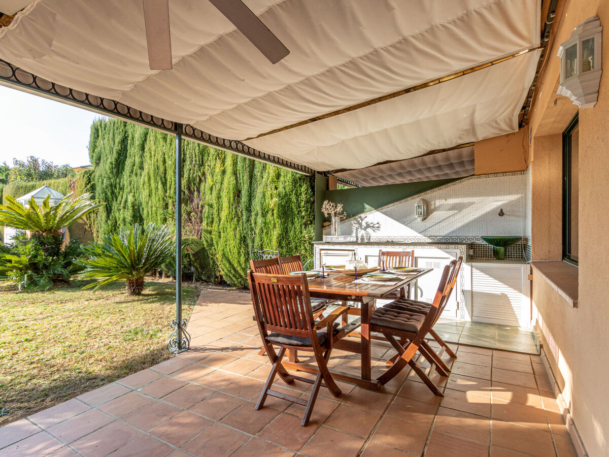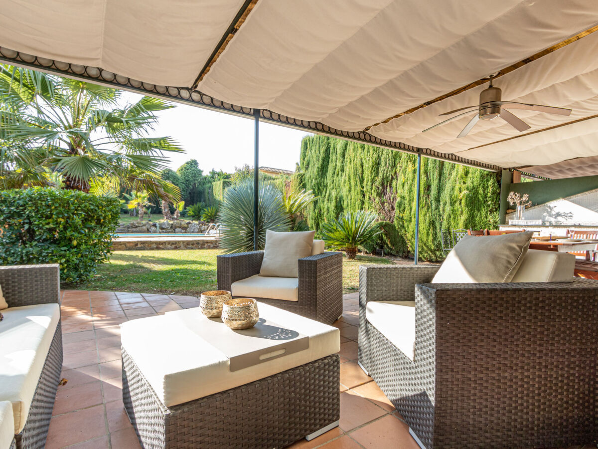 Douche extérieure, pool house avec plaque de cuisson, pergola, meubles de jardin.