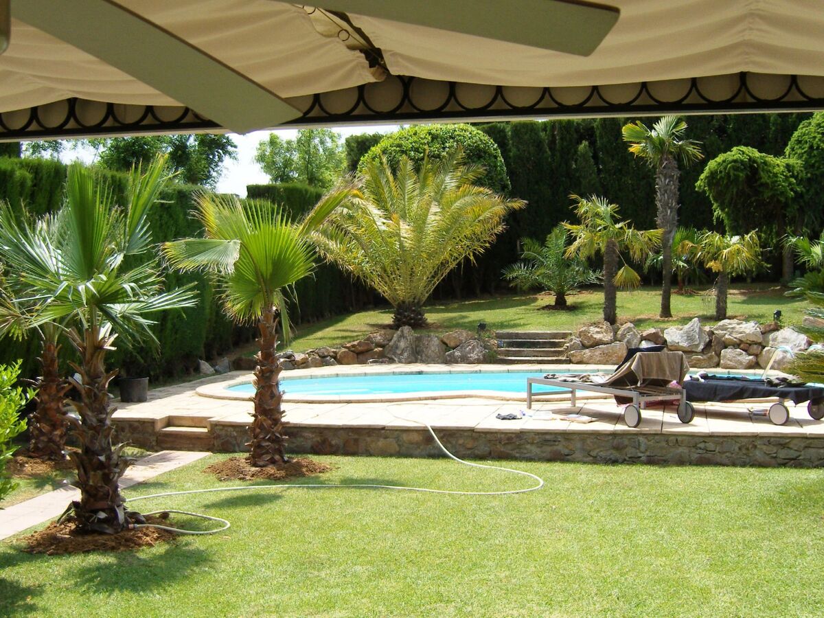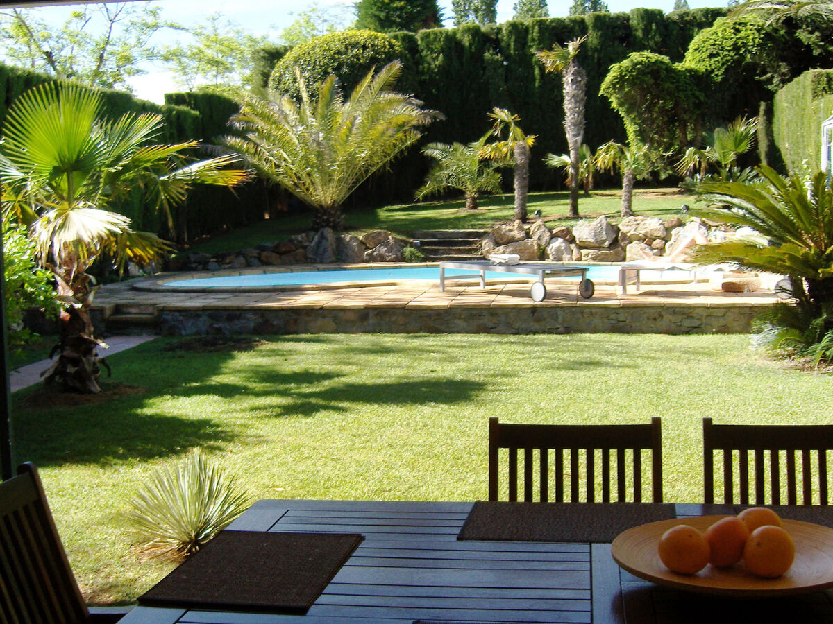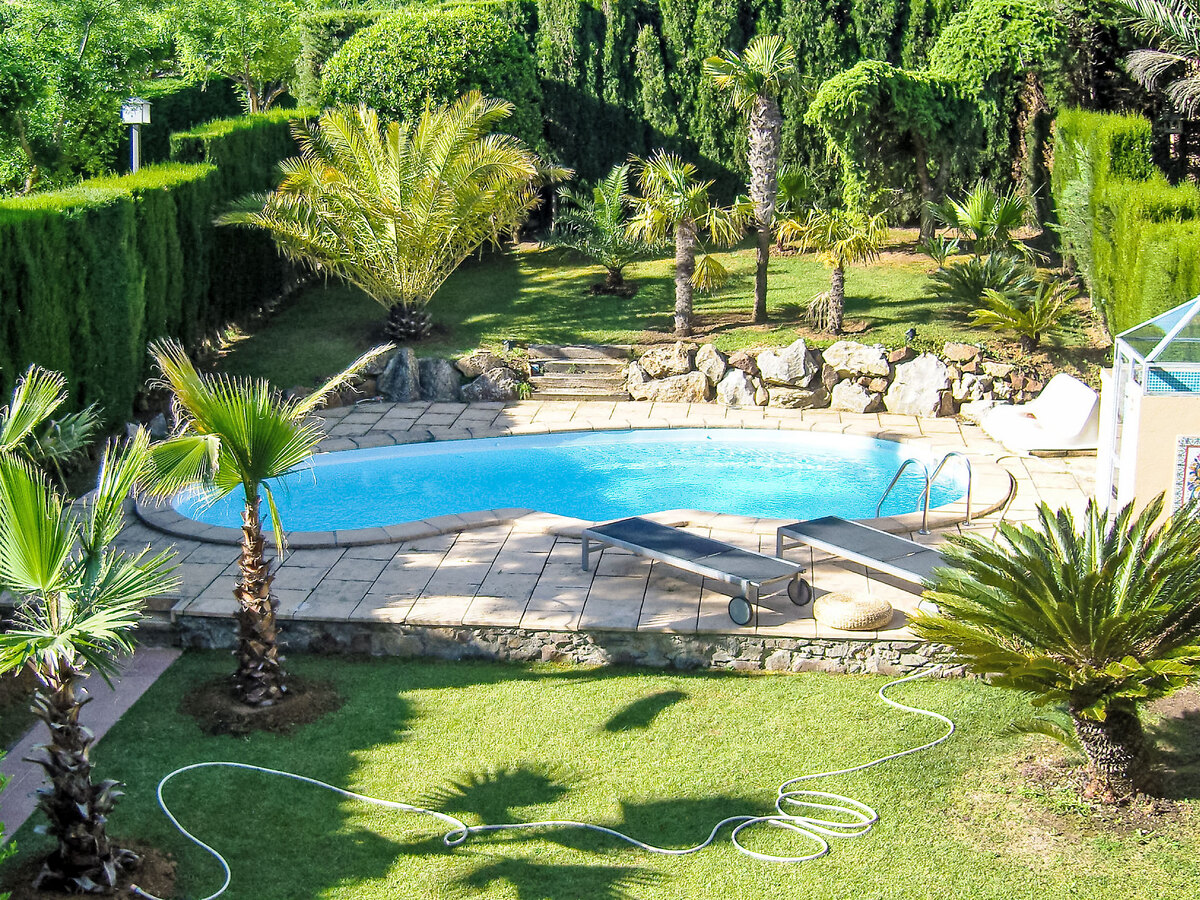 A usage privé: terrain 400 m2, beau jardin entretenu (clôturé) avec pelouse et plantes, piscine en forme d’haricot (3 x 7 m, disponibilité saisonnière: 01.Jan.