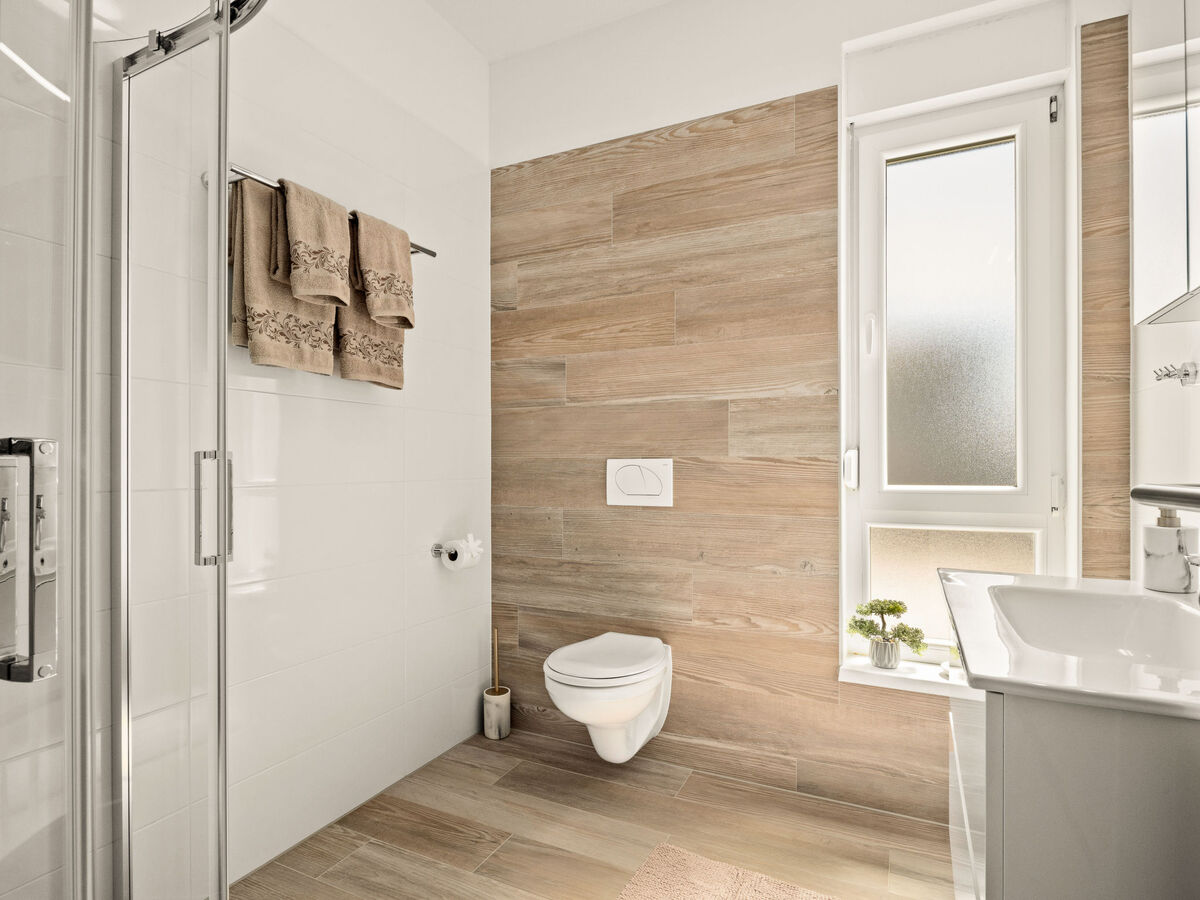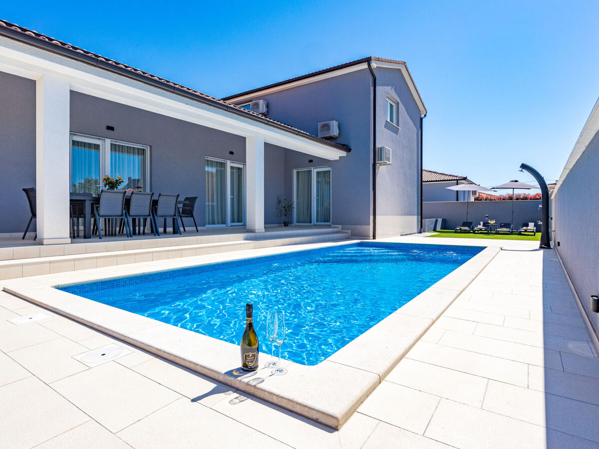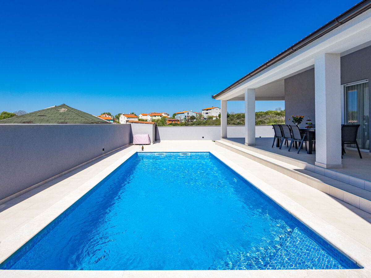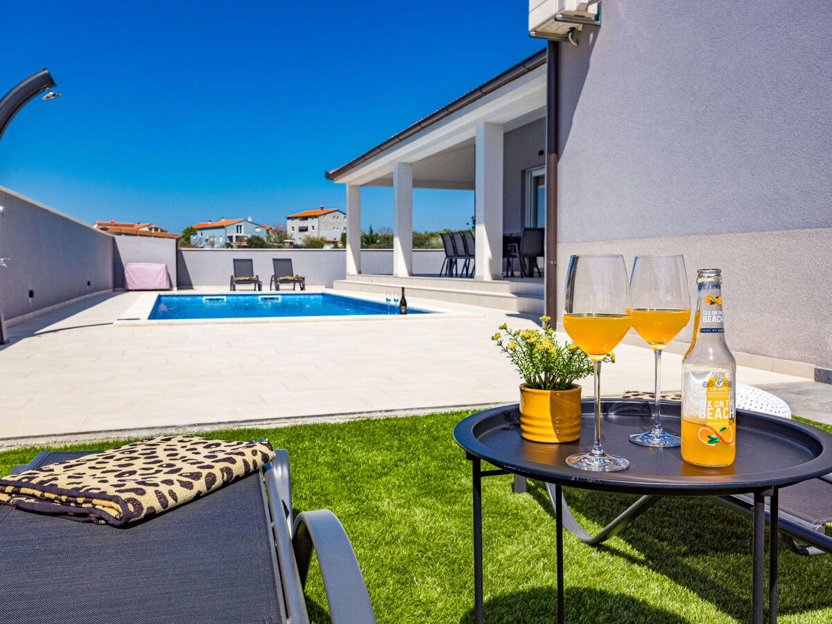 A usage privé: terrain 700 m2 (clôturé), jardin avec plantes et fleurs, piscine rectangulaire (8 x 4 m, profondeur 140 cm, disponibilité saisonnière: 29.Avr.