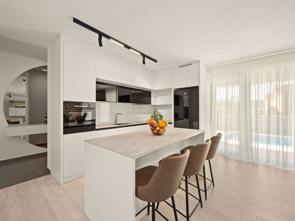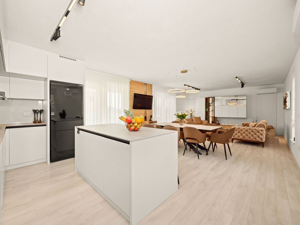 Cuisine ouverte (four, lave-vaisselle, 4 plaques à induction, grille-pain, bouilloire électrique, micro-ondes, congélateur, cafetière électrique).