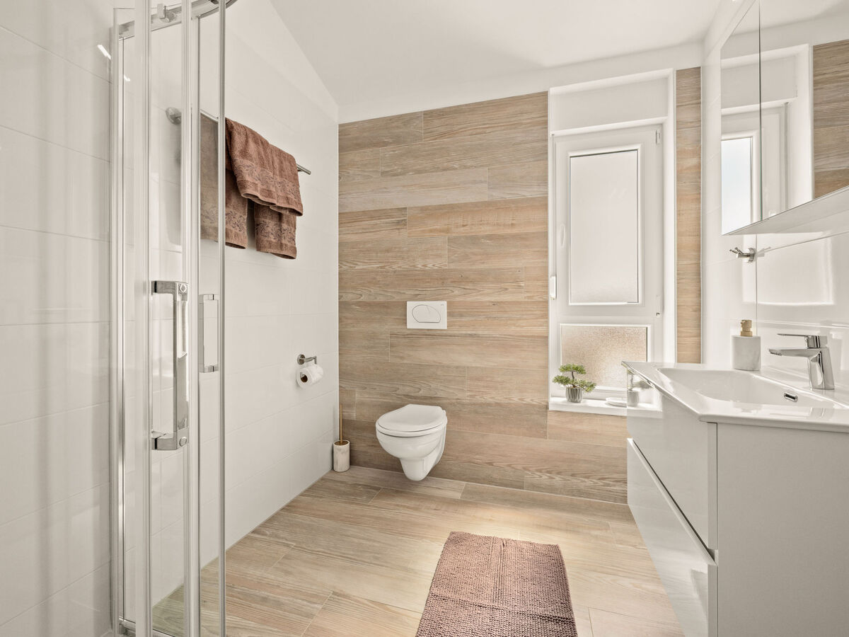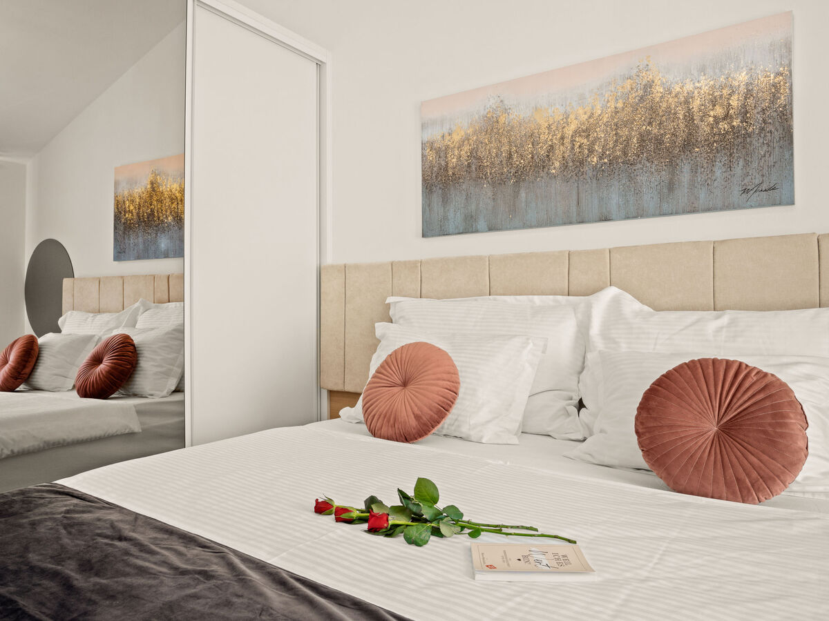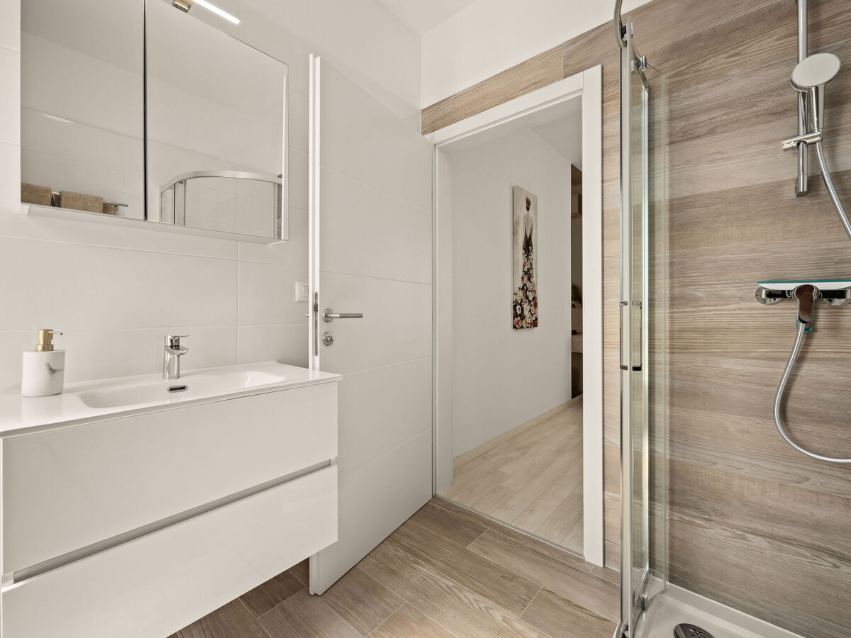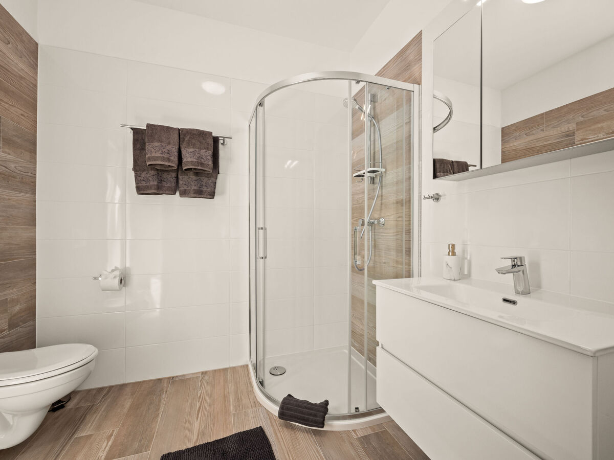 À l'étage supérieur: 2 chambres, chaque chambre avec: 1 grand-lit (180 cm, longueur 200 cm), douche/WC et TV (satellite) (écran plat), air-conditionné.