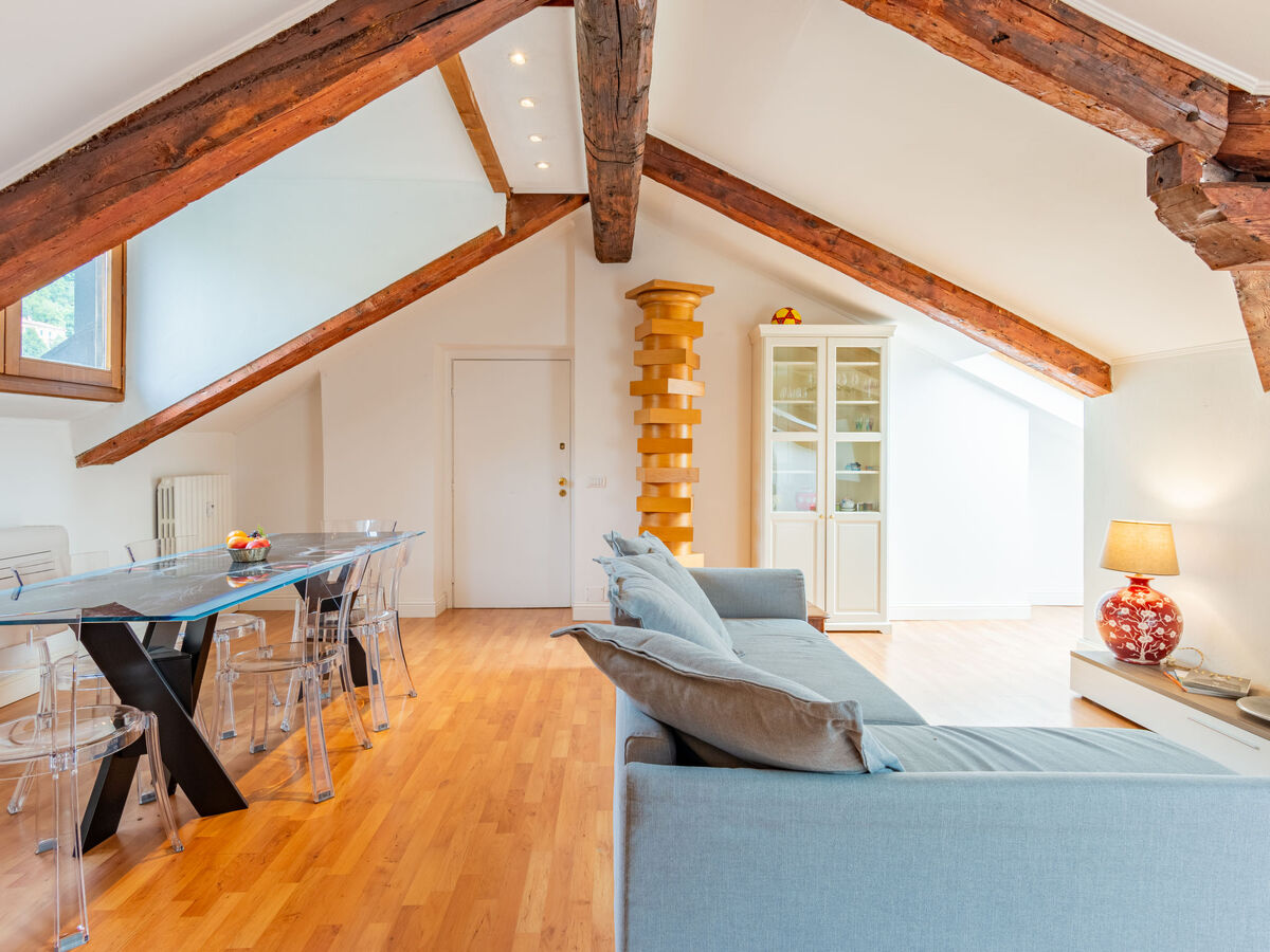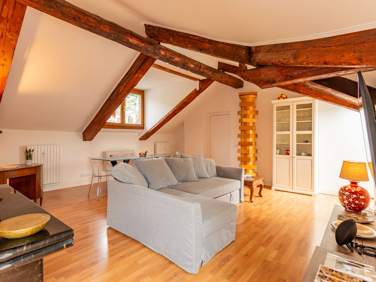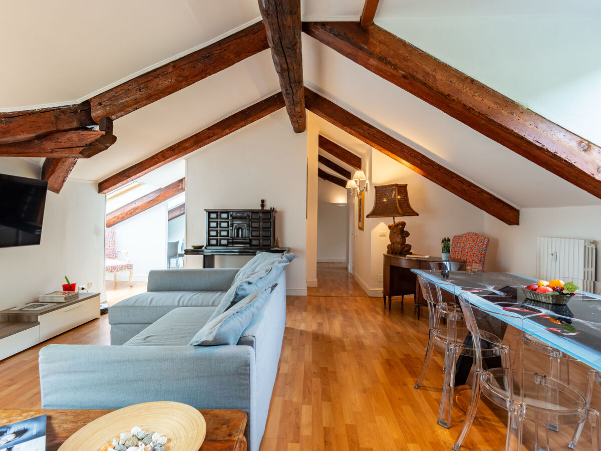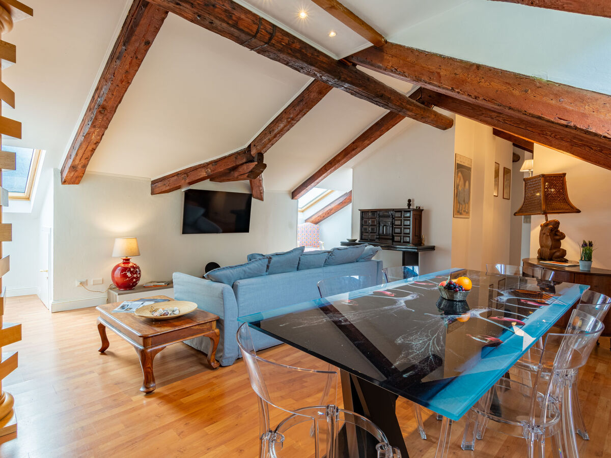 Partiellement mansardé, aménagement moderne et de bon goût: grand séjour/salle à manger avec TV.