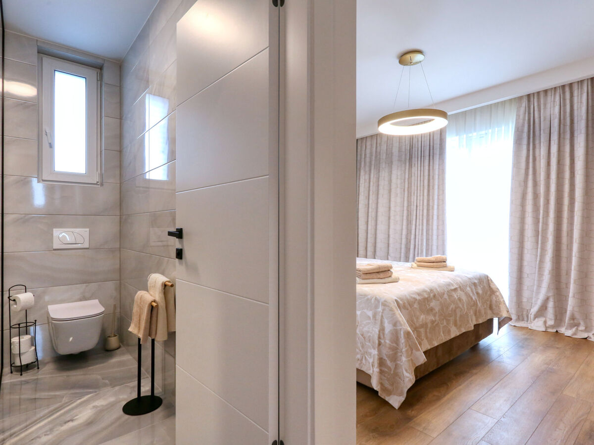 1 chambre avec 1 grand-lit (180 cm, longueur 200 cm), douche/WC et TV (écran plat), air-conditionné.