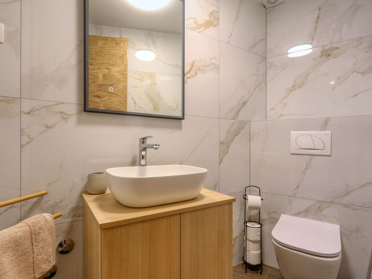 2ème étage: 1 chambre avec 1 grand-lit (160 cm, longueur 200 cm), douche/WC et TV (écran plat), air-conditionné.