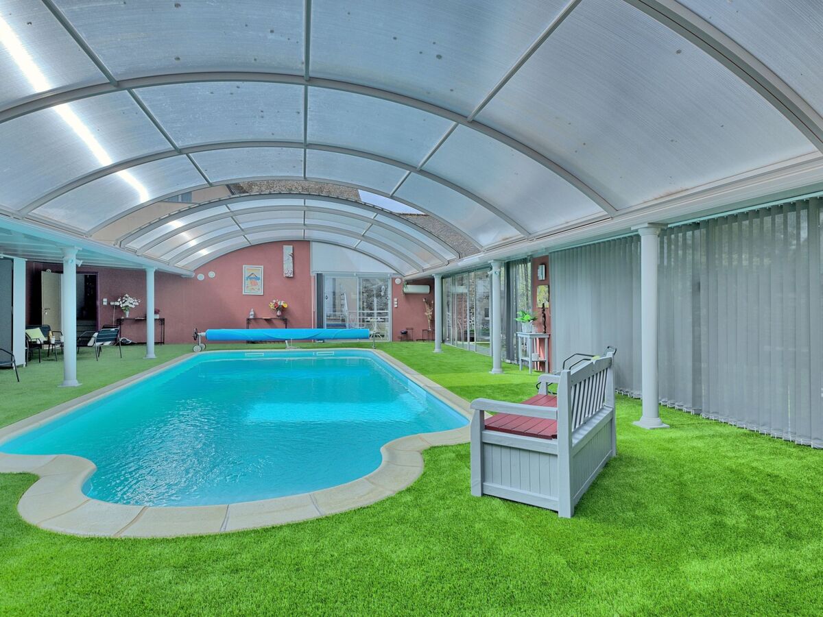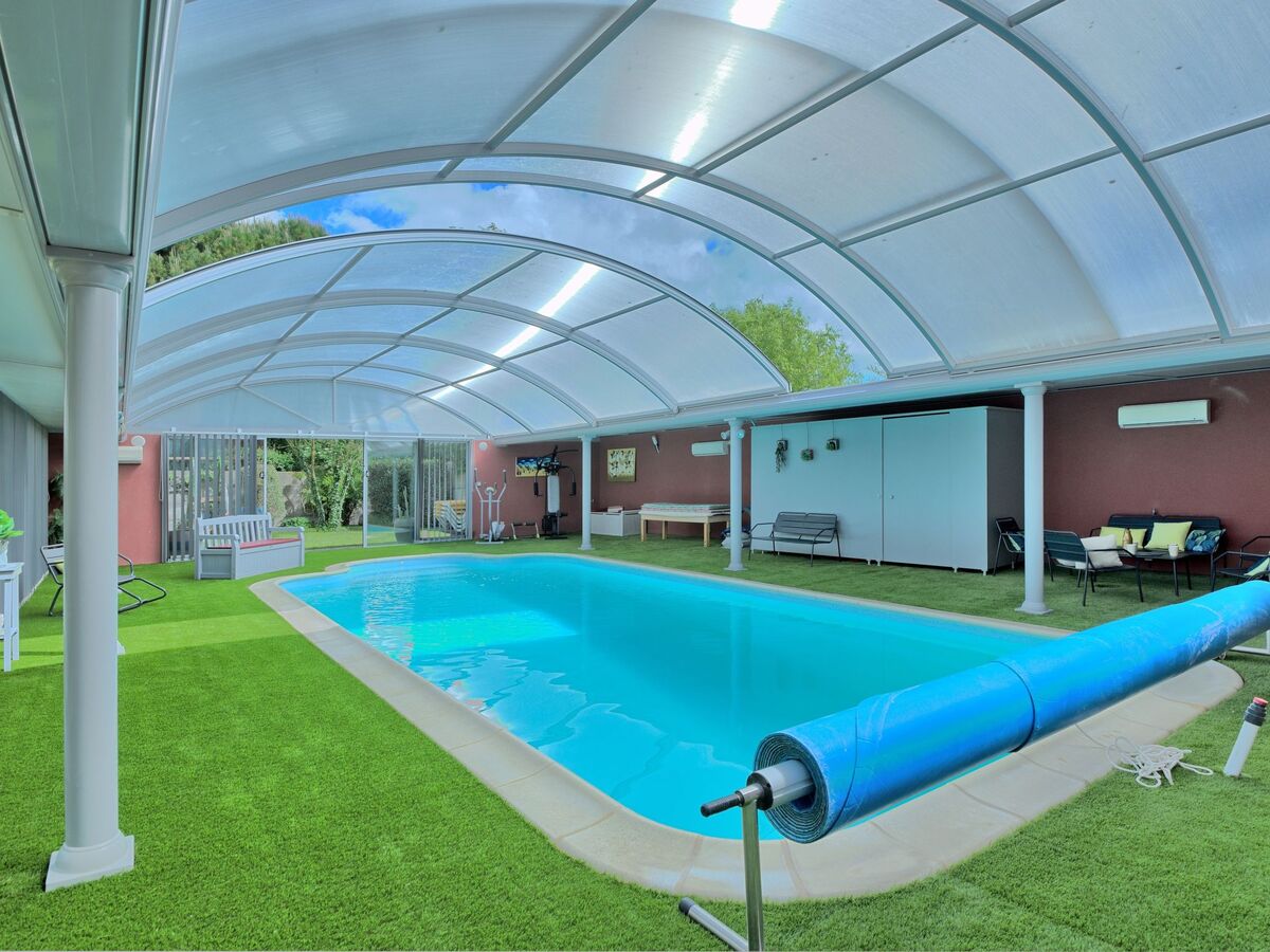 horaires d'ouverture de la piscine: 09:30-20:00) avec protection par couverture de volet.