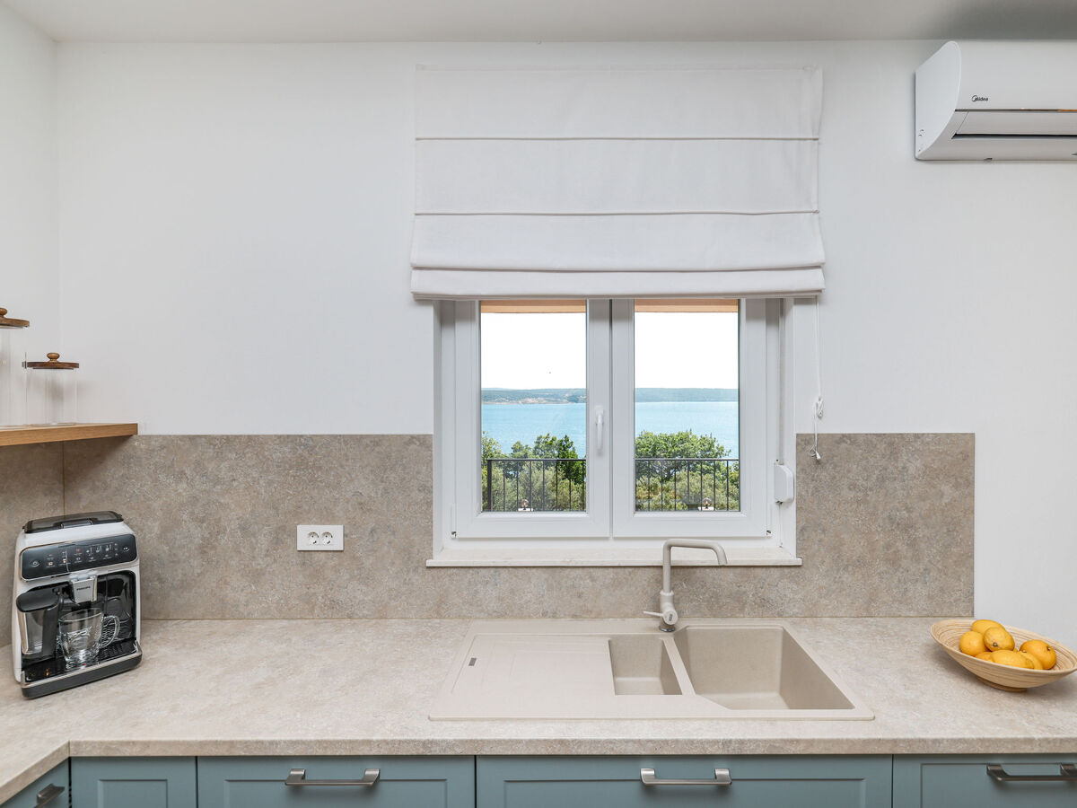 Cuisine ouverte (four, lave-vaisselle, 4 plaques à induction, bouilloire électrique, congélateur) avec air-conditionné.