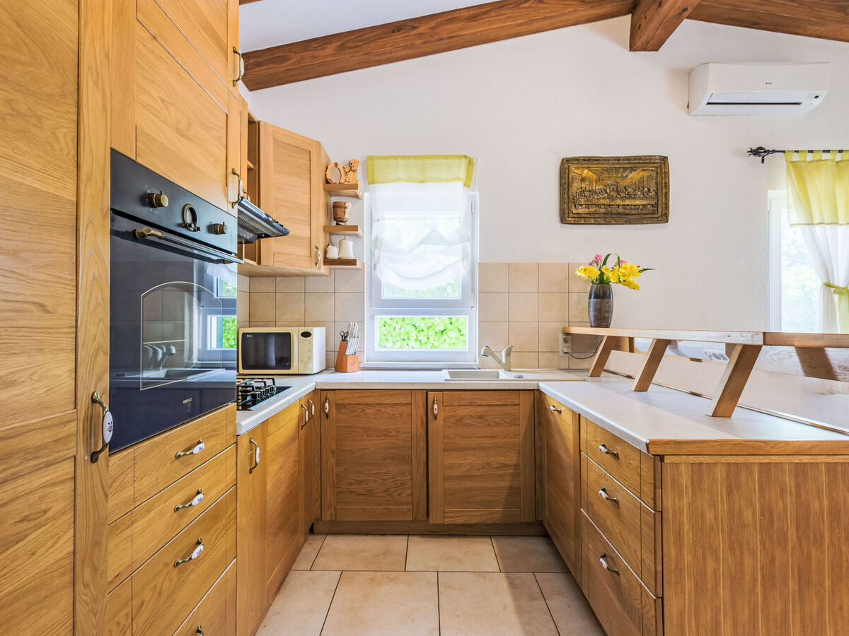 Cuisine ouverte (four, lave-vaisselle, 4 plaques vitrocéramiques, micro-ondes, congélateur).