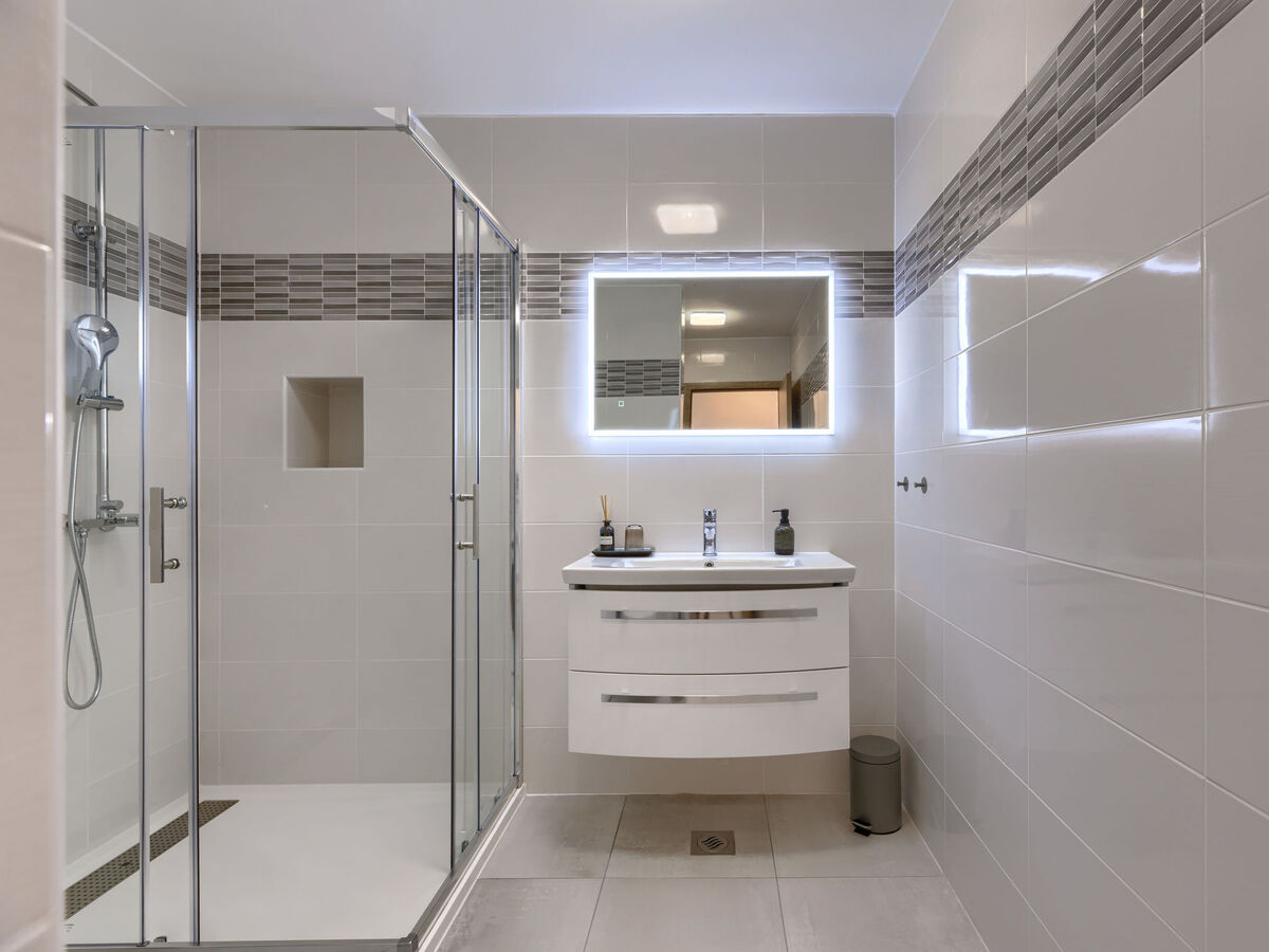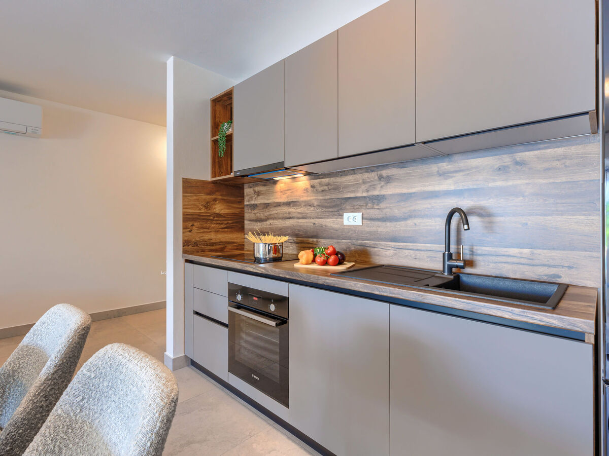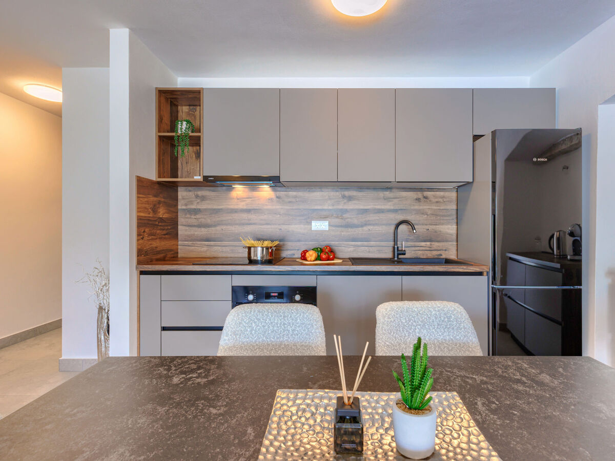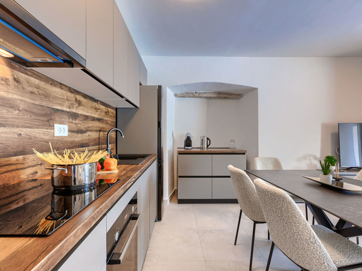 Cuisine ouverte (four, lave-vaisselle, 4 plaques vitrocéramiques, grille-pain, bouilloire électrique, micro-ondes, congélateur, cafetière électrique).