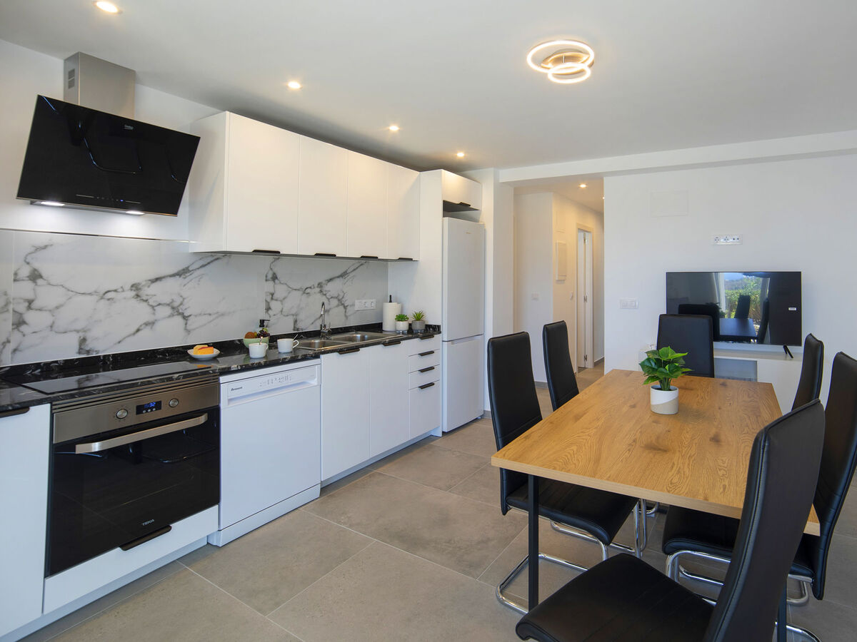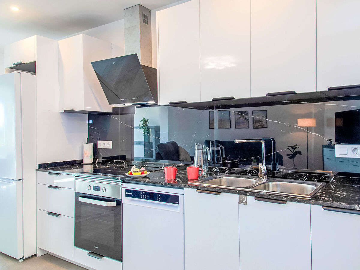 Cuisine ouverte (four, lave-vaisselle, 3 plaques à induction, grille-pain, bouilloire électrique, congélateur, cafetière électrique).