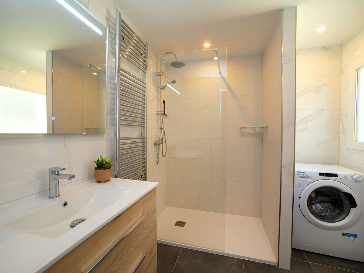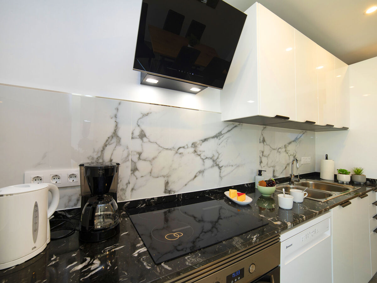 Cuisine ouverte (four, lave-vaisselle, 4 plaques à induction, grille-pain, bouilloire électrique, micro-ondes, congélateur, cafetière électrique).