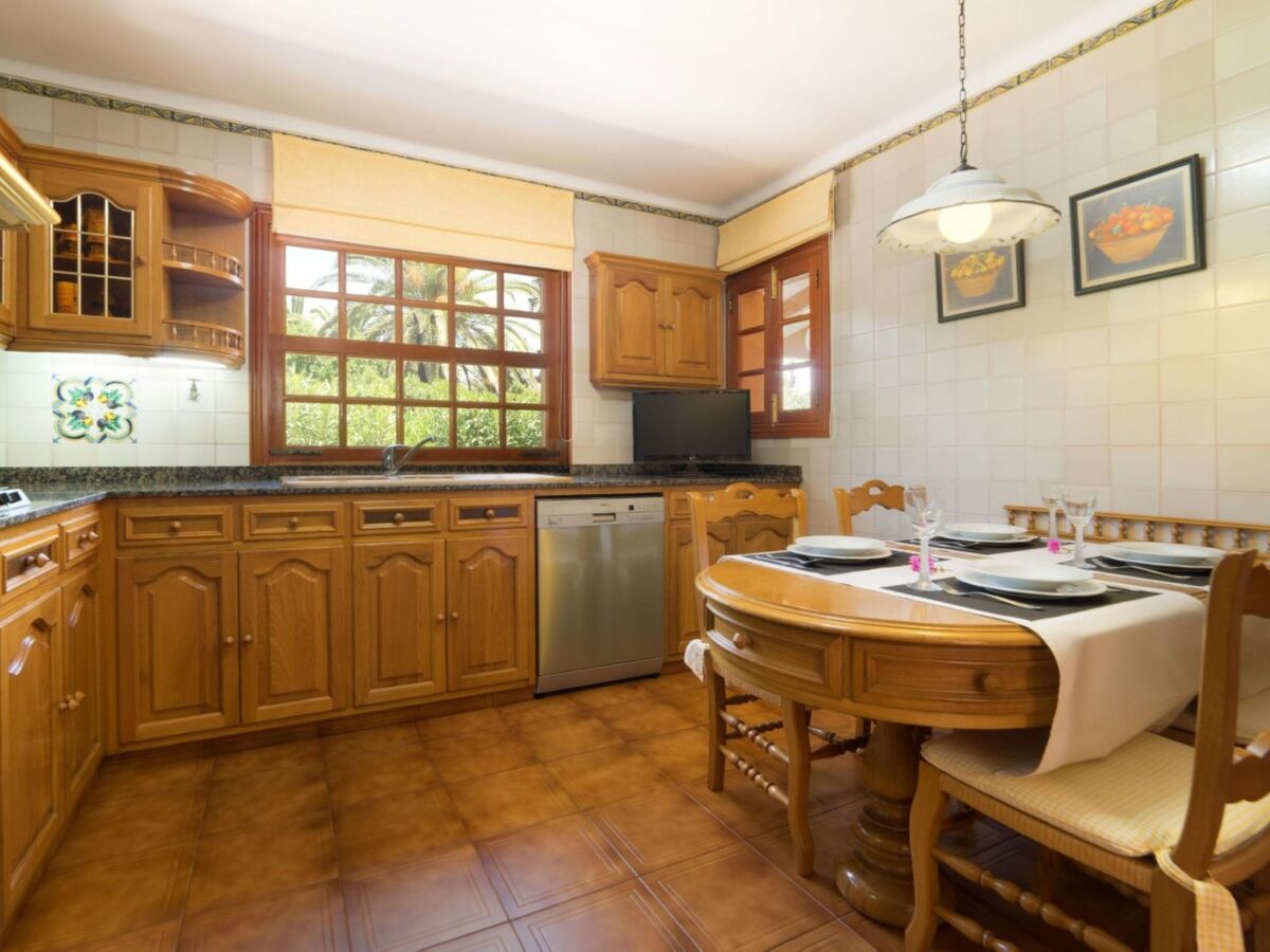 Grande cuisine (4 plaques de cuisson, four, lave-vaisselle, grille-pain, bouilloire électrique, micro-ondes, cafetière électrique) avec table pour les repas.