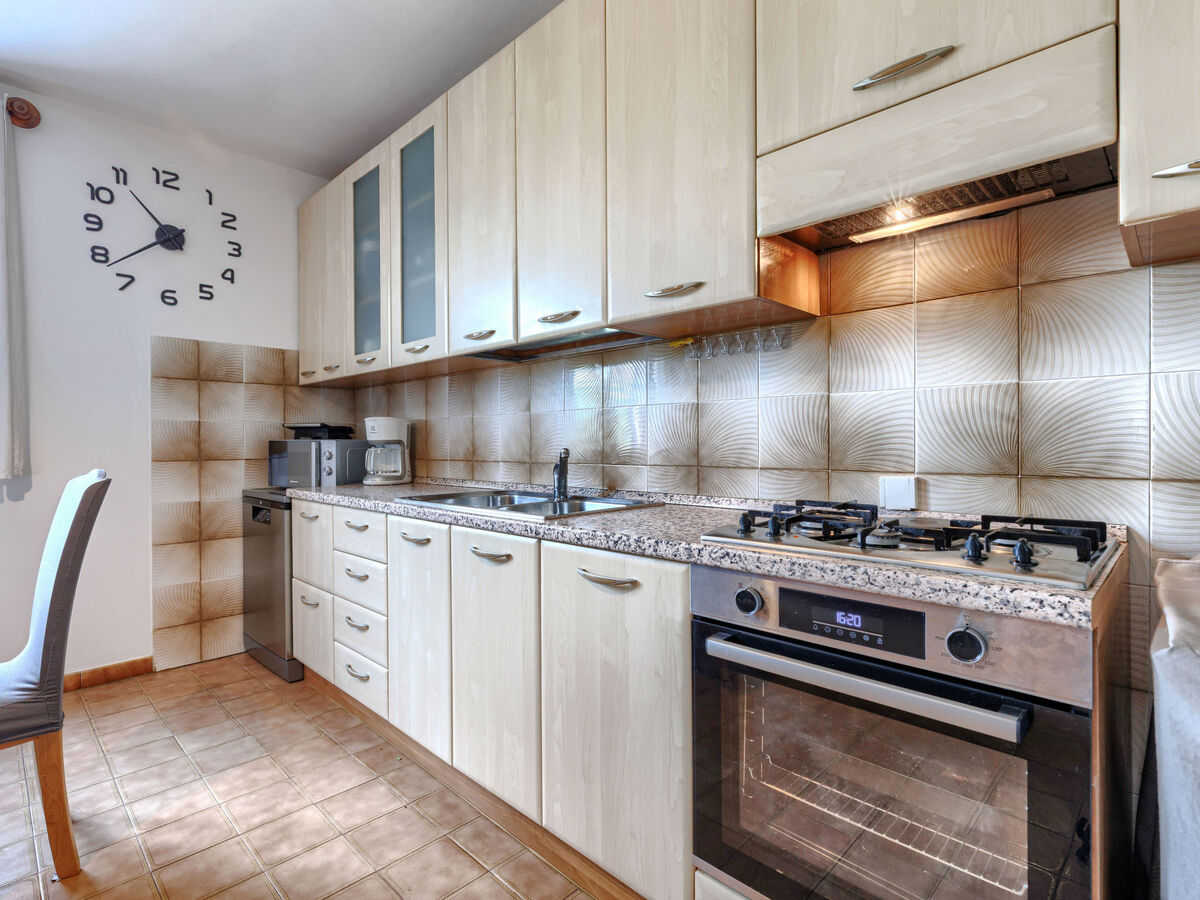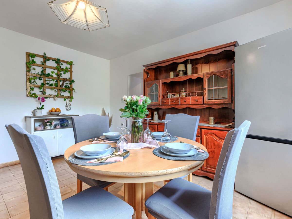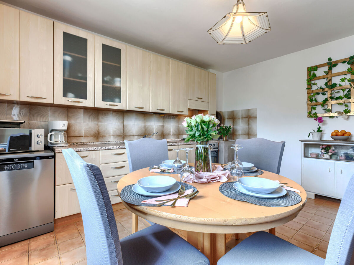 Cuisine (1 plaque de cuisson, four, lave-vaisselle, 3 feux, grille-pain, bouilloire électrique, micro-ondes, congélateur, cafetière électrique) avec table pour les repas.