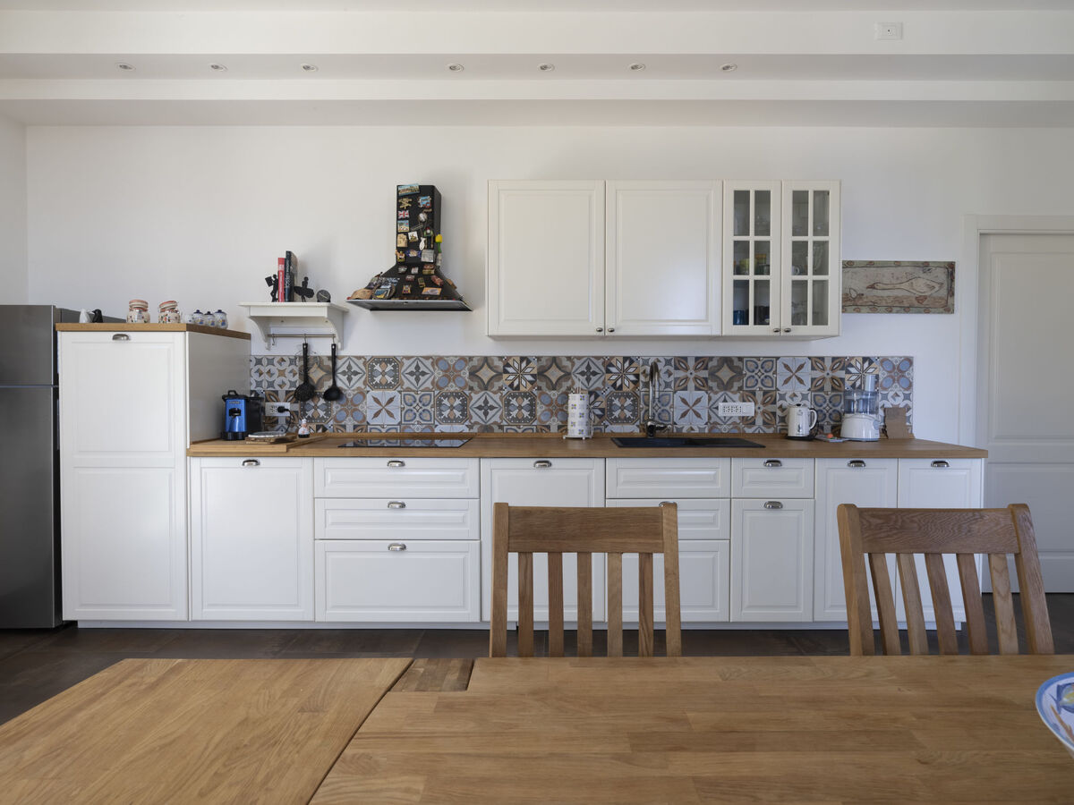 Cuisine (four, lave-vaisselle, 4 feux, grille-pain, bouilloire électrique, micro-ondes, cafetière électrique) avec table pour les repas.