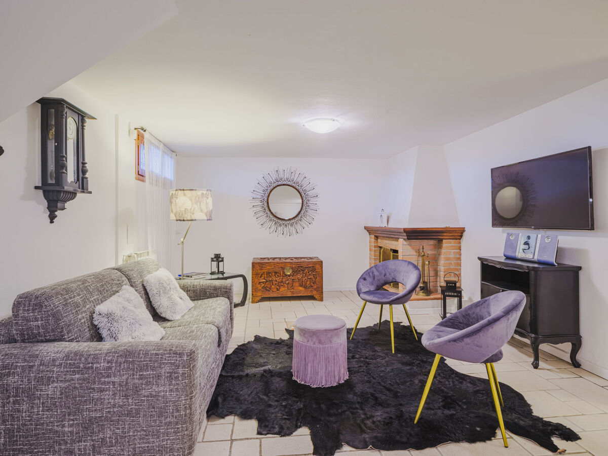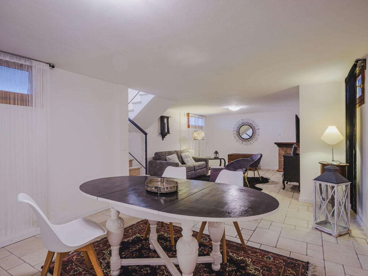 À l'étage inférieur: grand séjour/salle à manger avec 1 divan-lit double et cheminée (uniquement à titre de décoration), table pour les repas, coin-cuisine et TV (écran plat).