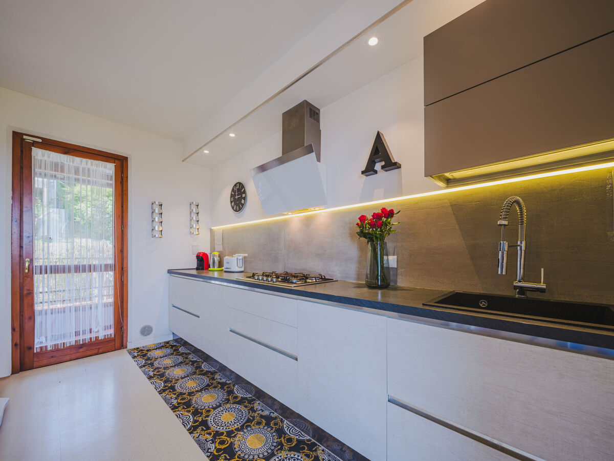 Cuisine ouverte (5 plaques de cuisson, four, Poêle à gaz, grille-pain, bouilloire électrique, cafetière électrique) avec table pour les repas.