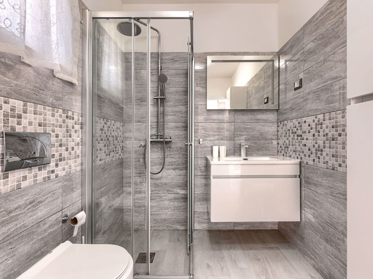 Douche extérieure, terrasse (50 m2), meubles de jardin.