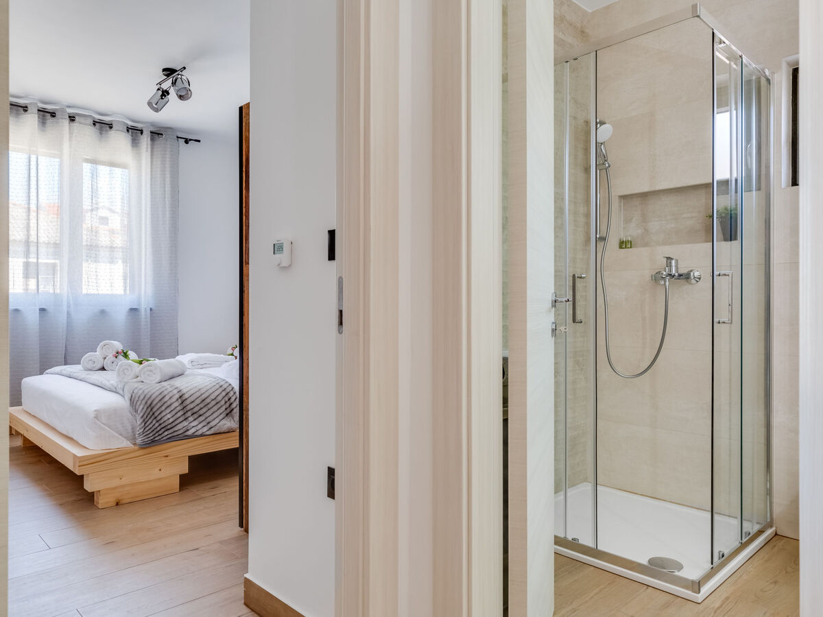 1 chambre avec 1 grand-lit (160 cm, longueur 200 cm), bain/WC et air-conditionné.