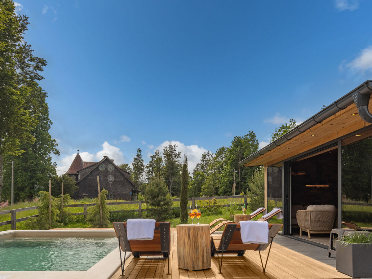 A usage privé: terrain 1'900 m2, piscine rectangulaire, chauffée (6 x 4 m, profondeur 150 cm, disponibilité saisonnière: 01.Jun.
