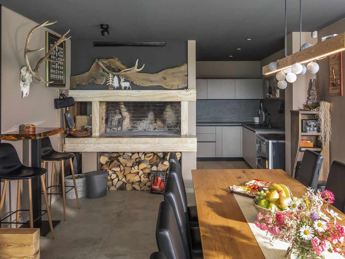 Salon avec cheminée, table pour les repas et coin-cuisine.
