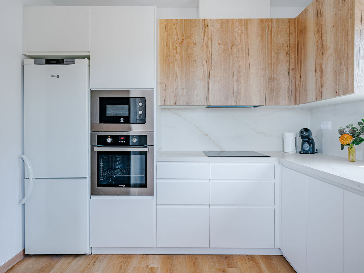 Grande cuisine (four, lave-vaisselle, 4 plaques vitrocéramiques, grille-pain, bouilloire électrique, micro-ondes, congélateur, cafetière électrique).