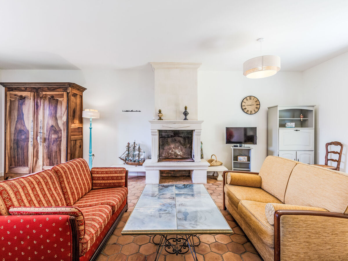 Grand séjour/salle à manger 50 m2 avec 1 divan-lit double (1 x 140 cm, longueur 190 cm), cheminée (uniquement à titre de décoration), table pour les repas et TV (écran plat).