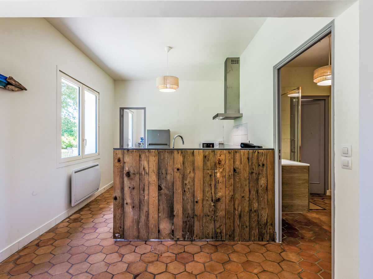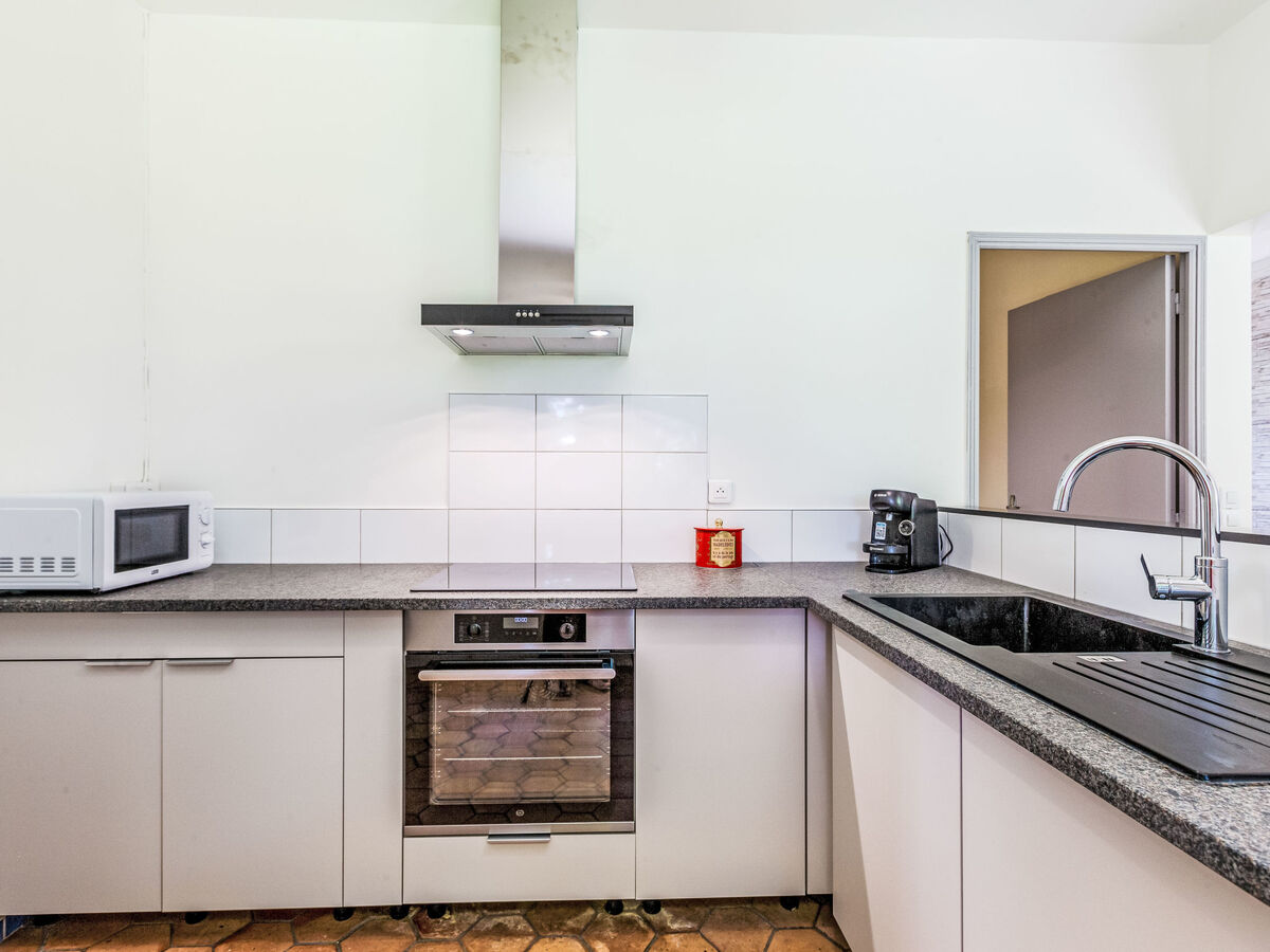 Cuisine ouverte (four, 3 plaques vitrocéramiques, grille-pain, bouilloire électrique, micro-ondes, congélateur, cafetière électrique) avec bar.