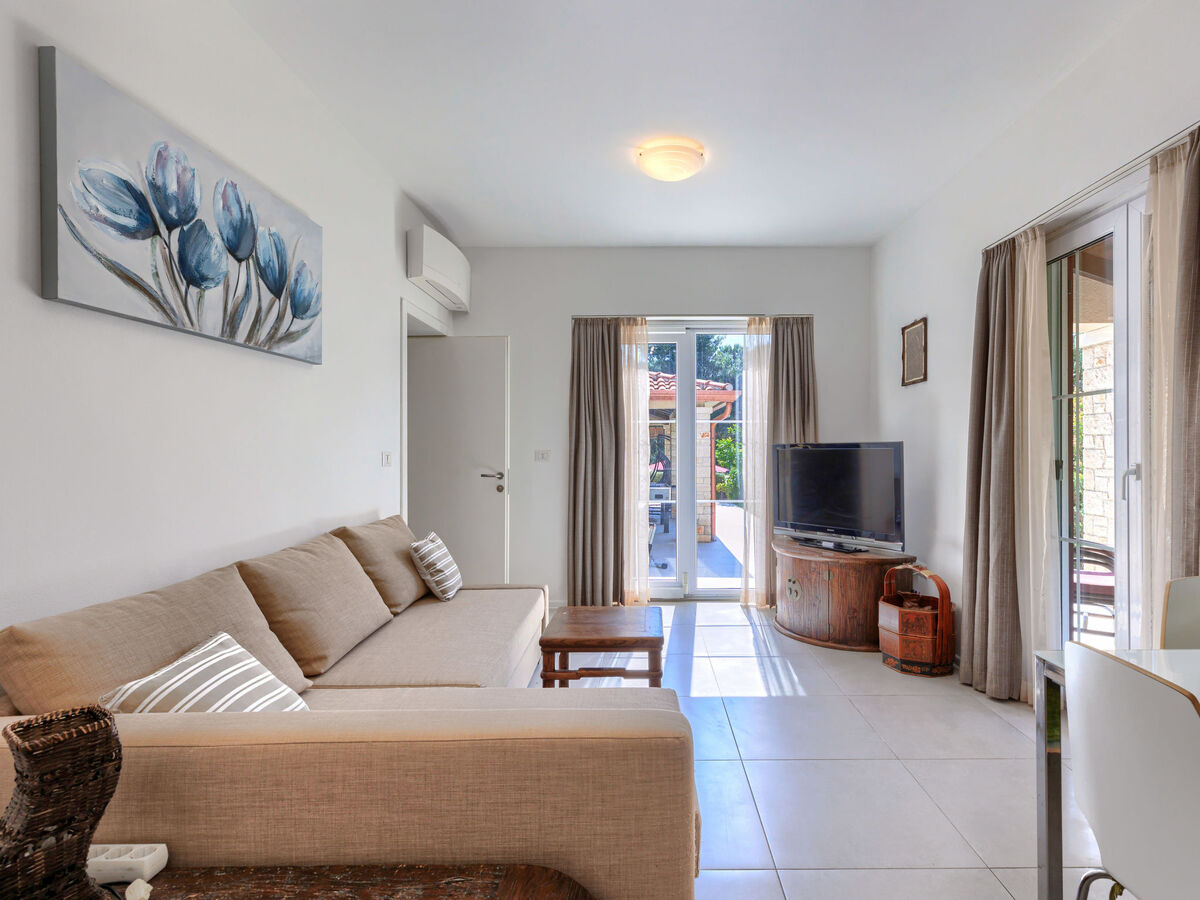 Aménagement agréable et de bon goût: séjour/salle à manger avec 1 divan-lit double (160 cm, longueur 200 cm), TV (satellite) et air-conditionné.