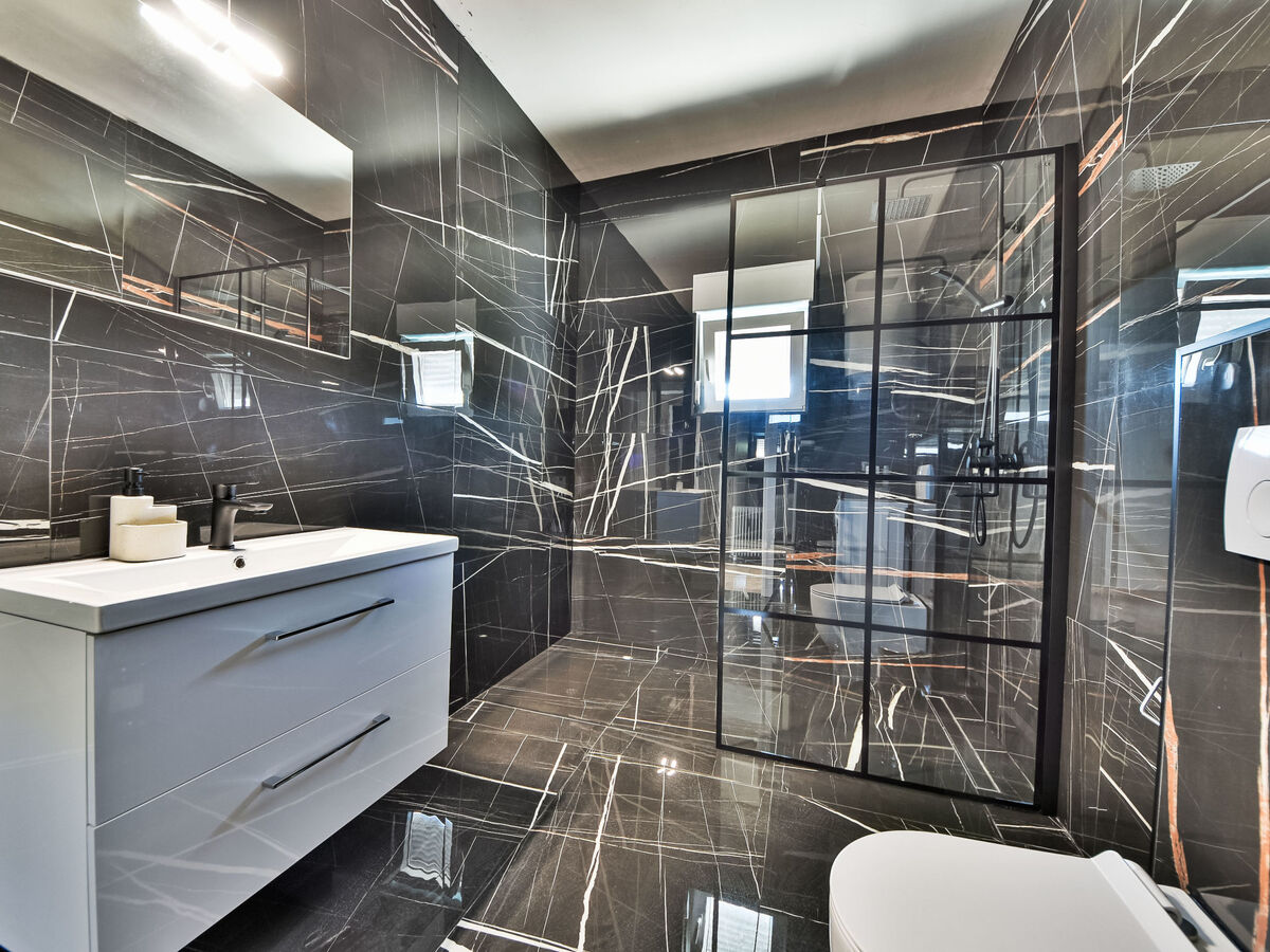 Douche extérieure, meubles de jardin, barbecue (balançoire).