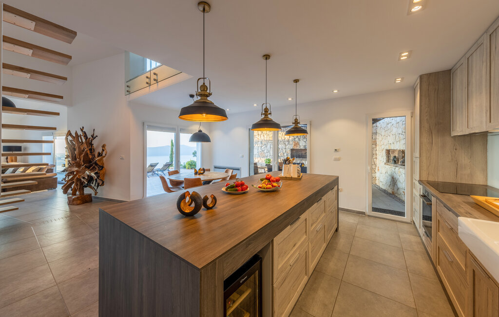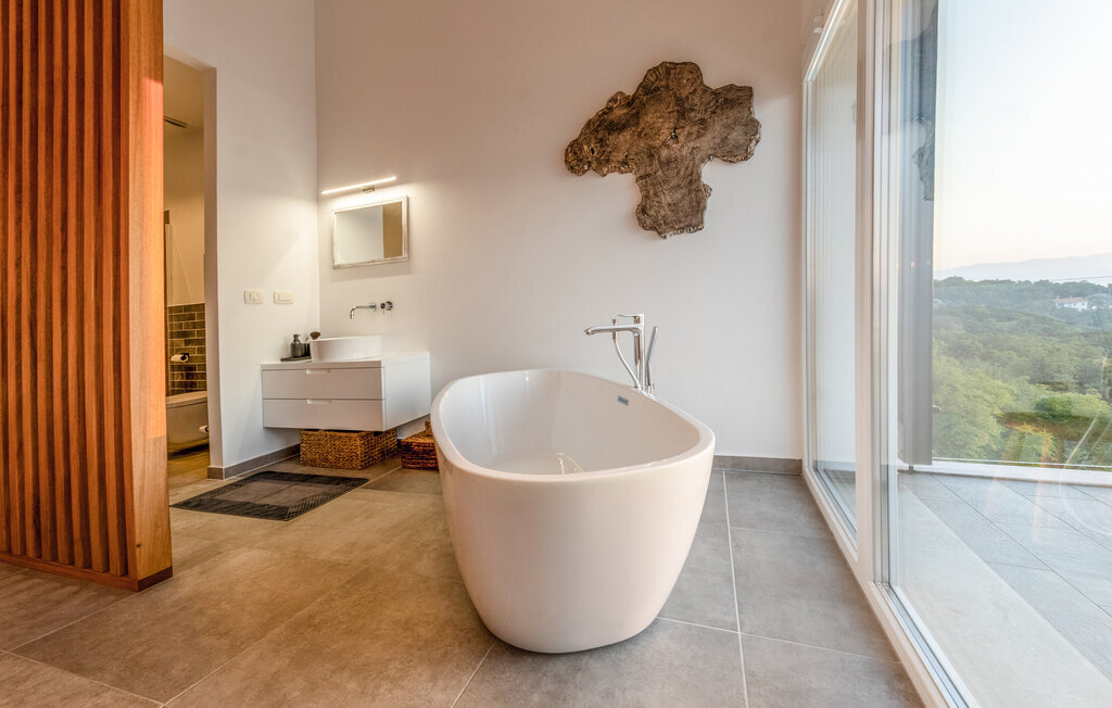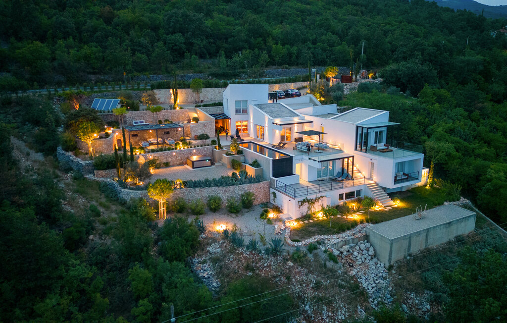 La villa Sentio à Sveta Jelena surplombe majestueusement la mer Adriatique et vous offre une vue panoramique à couper le souffle sur la baie de Kvarner, les îles environnantes et le paysage montagneux enchanteur. Laissez-vous envoûter par ce décor spectaculaire qui vous enchantera chaque jour.