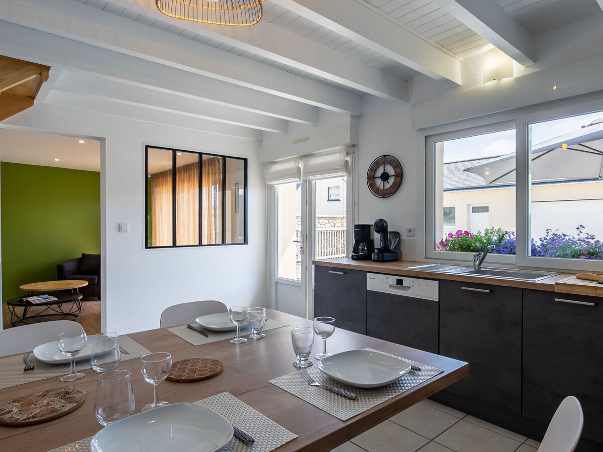 Cuisine ouverte 20 m2 (four, 3 plaques à induction, grille-pain, bouilloire électrique, micro-ondes, congélateur, cafetière électrique, Capsules pour machine à café (Dolce Gusto) (NON INCLUSES)) avec table pour les repas.