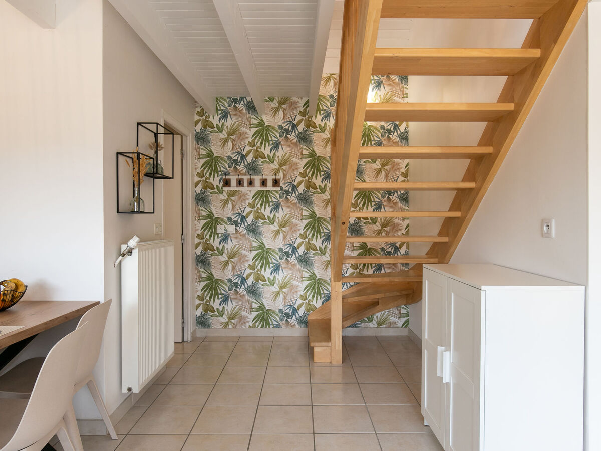 À l'étage supérieur: 1 chambre avec 1 grand-lit (160 cm, longueur 200 cm), WC séparés.